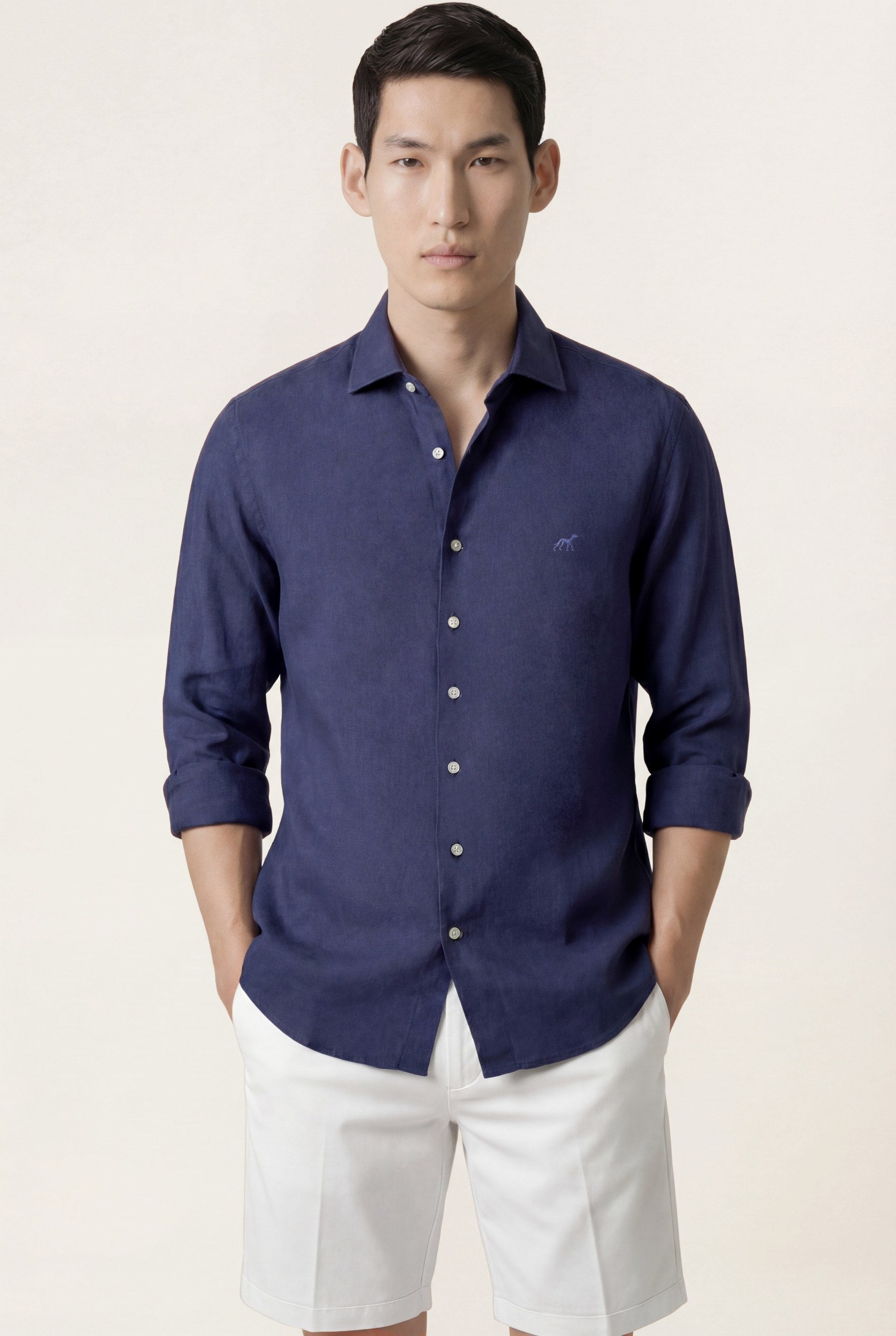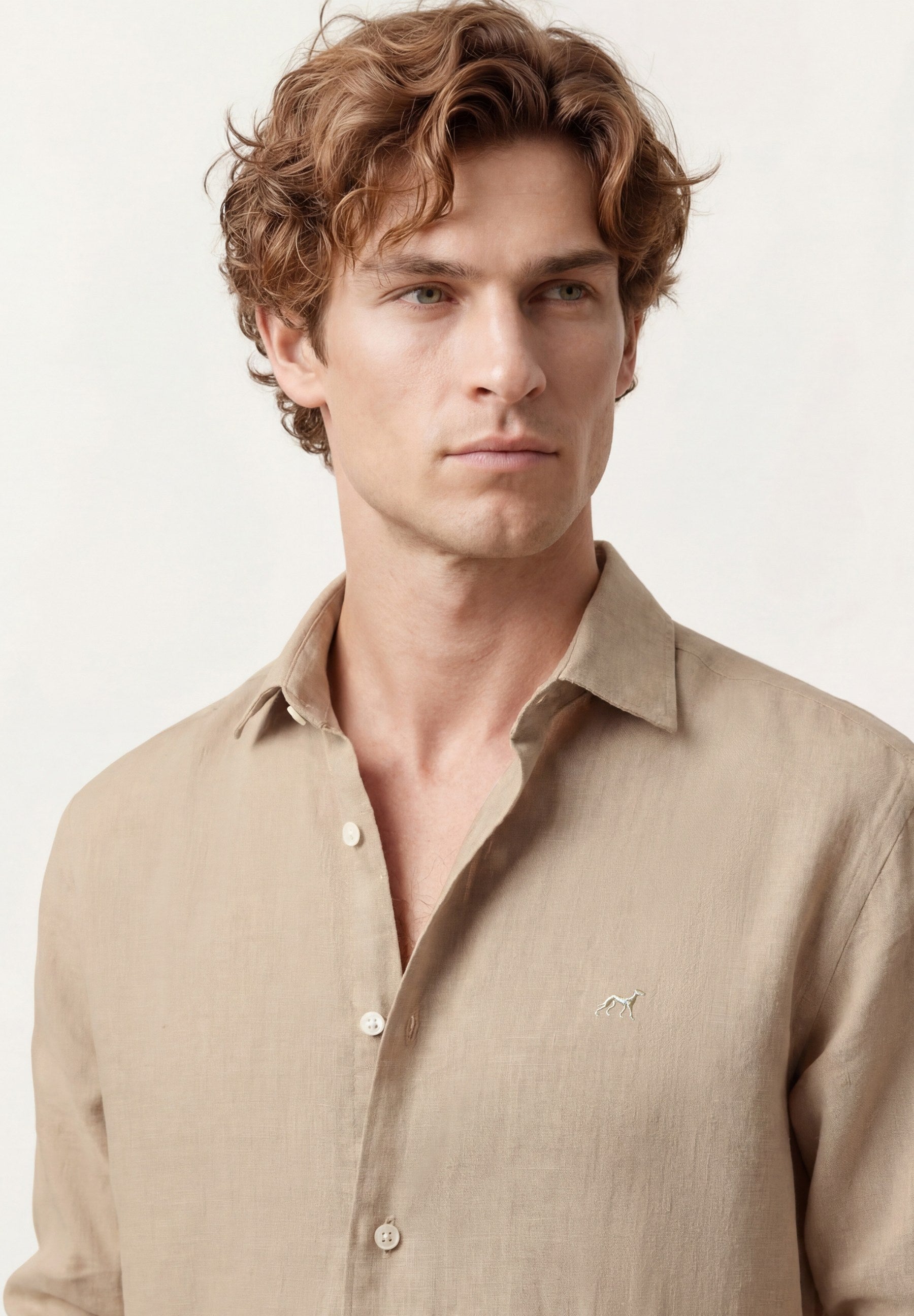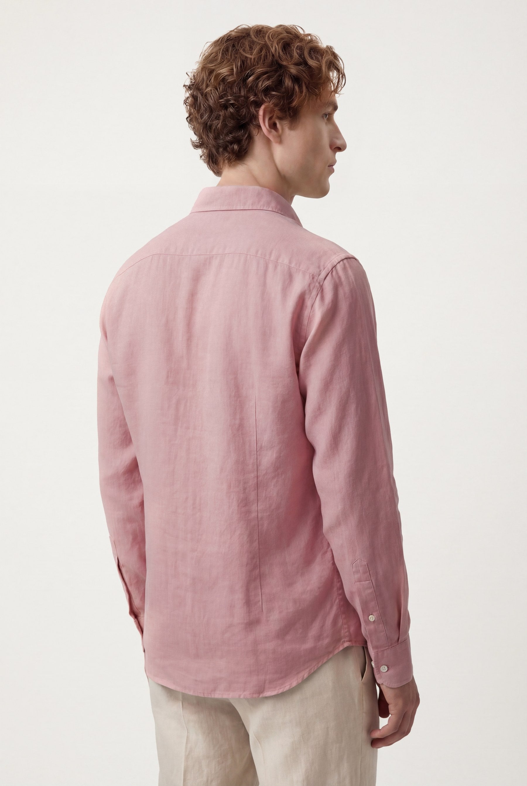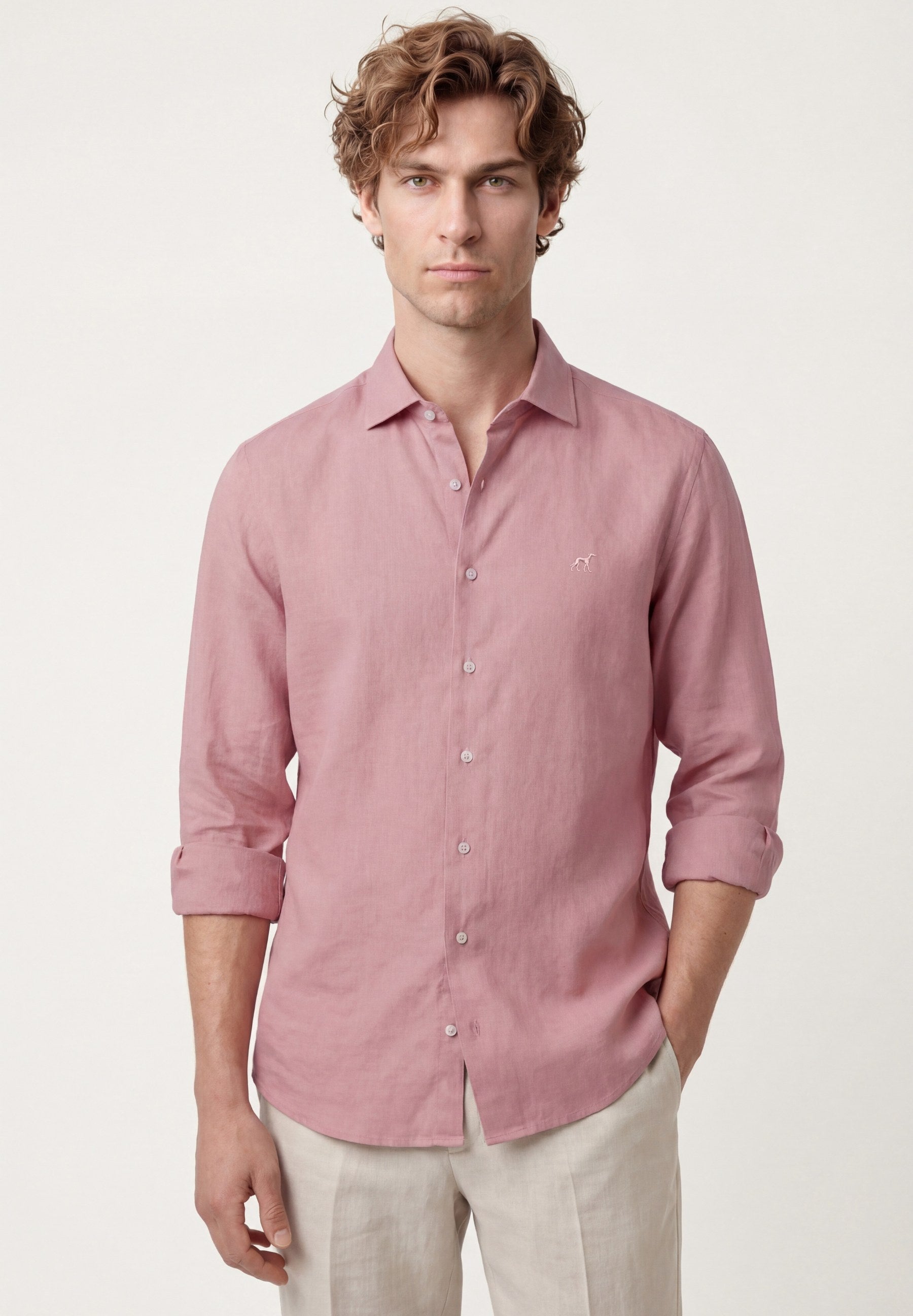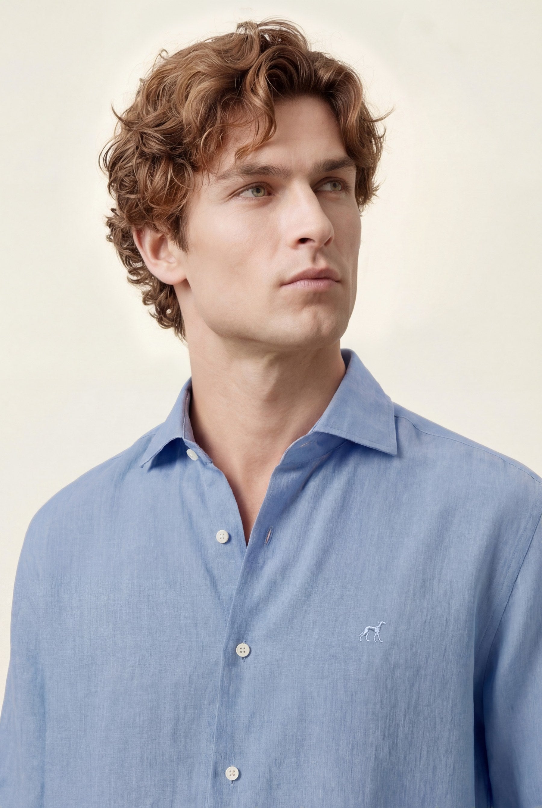 Camisa em algodão e linho, garment dyed, colarinho aberto, slim fit