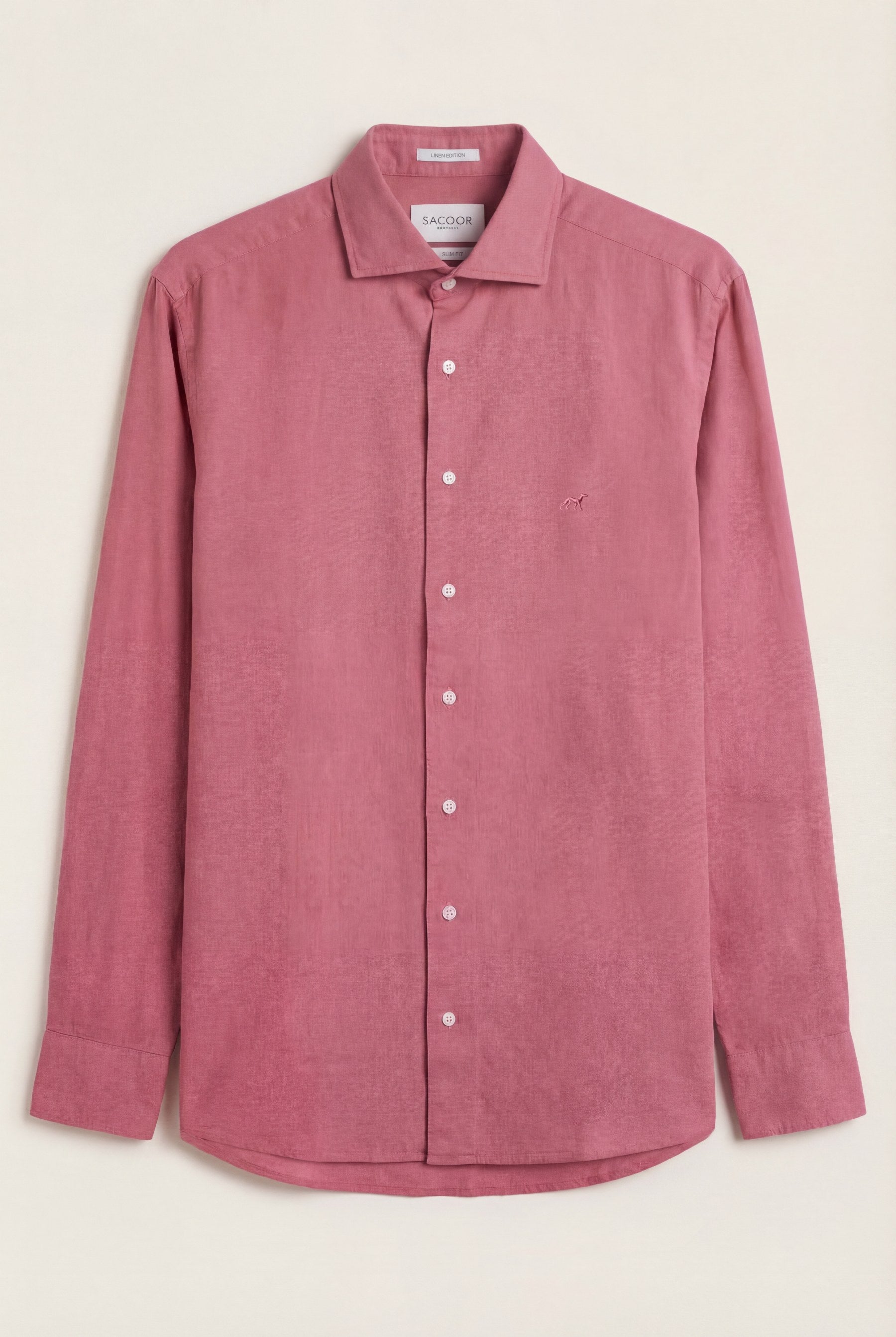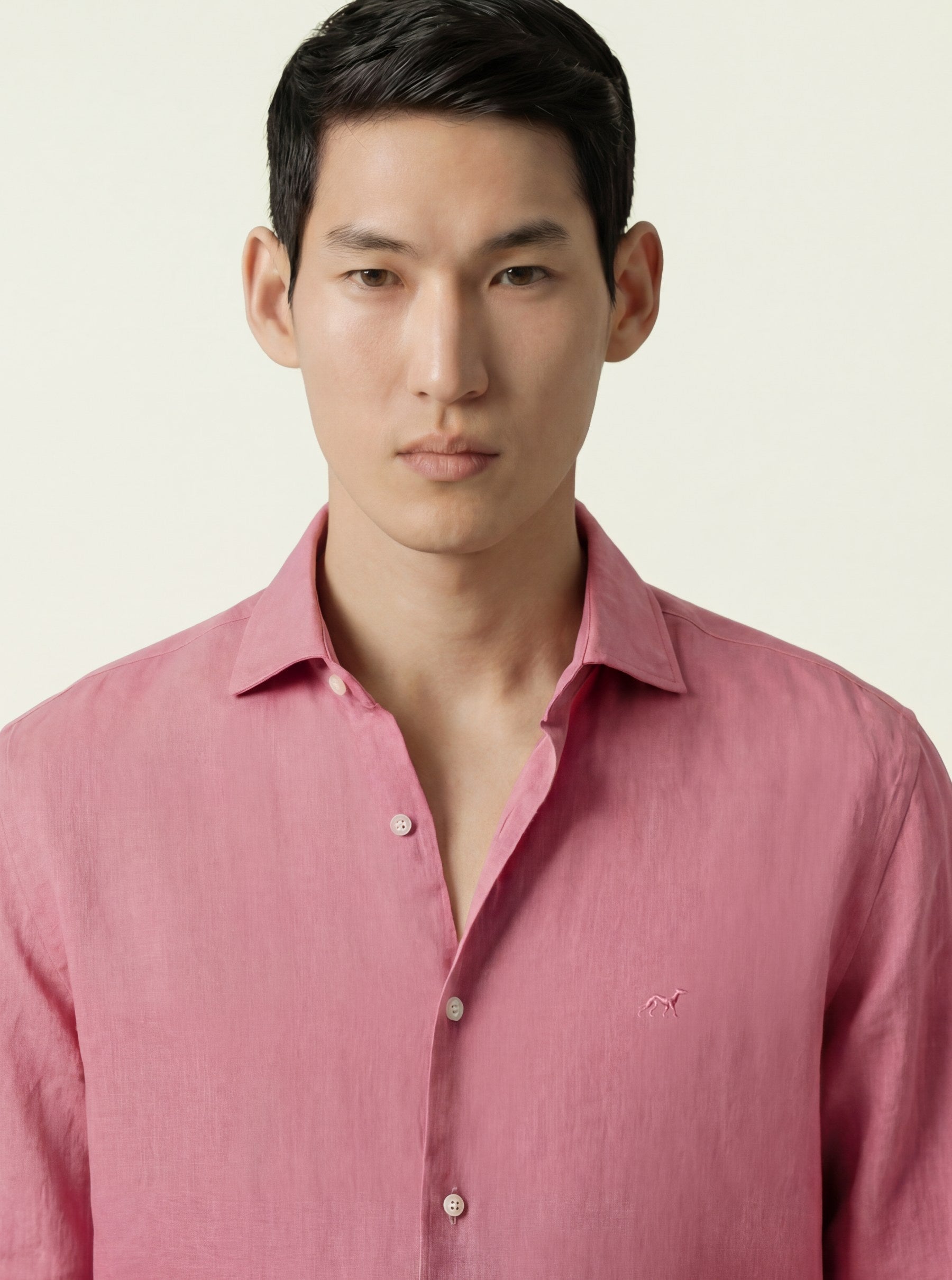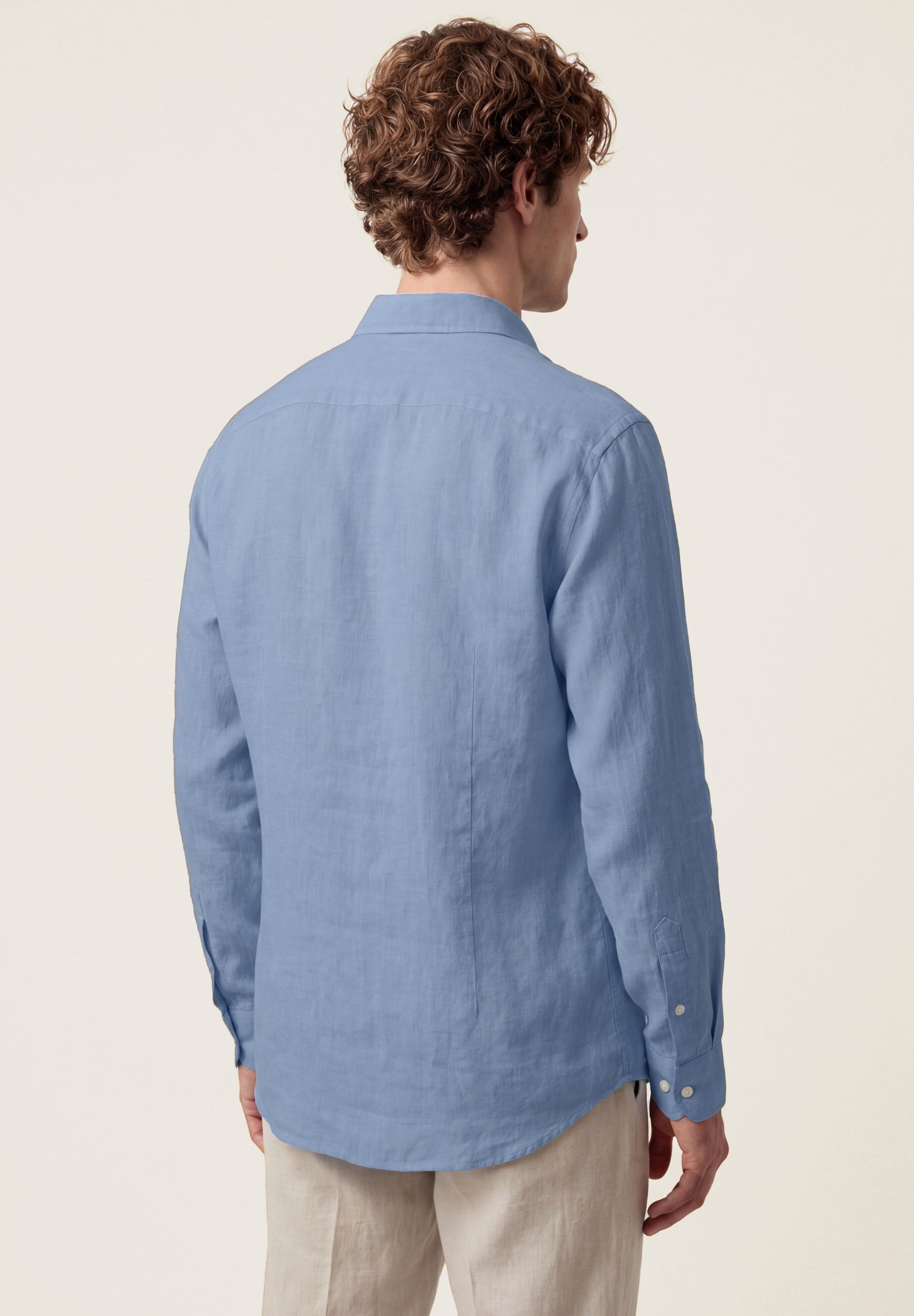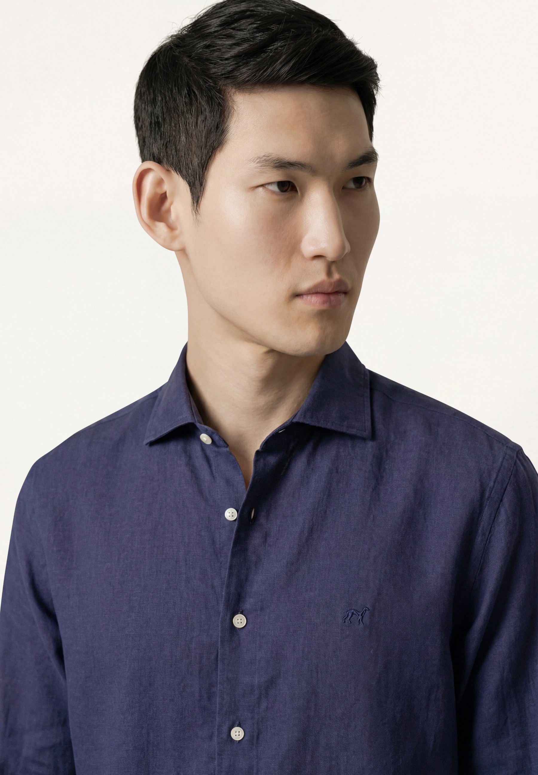 Camisa em algodão e linho, garment dyed, colarinho aberto, slim fit