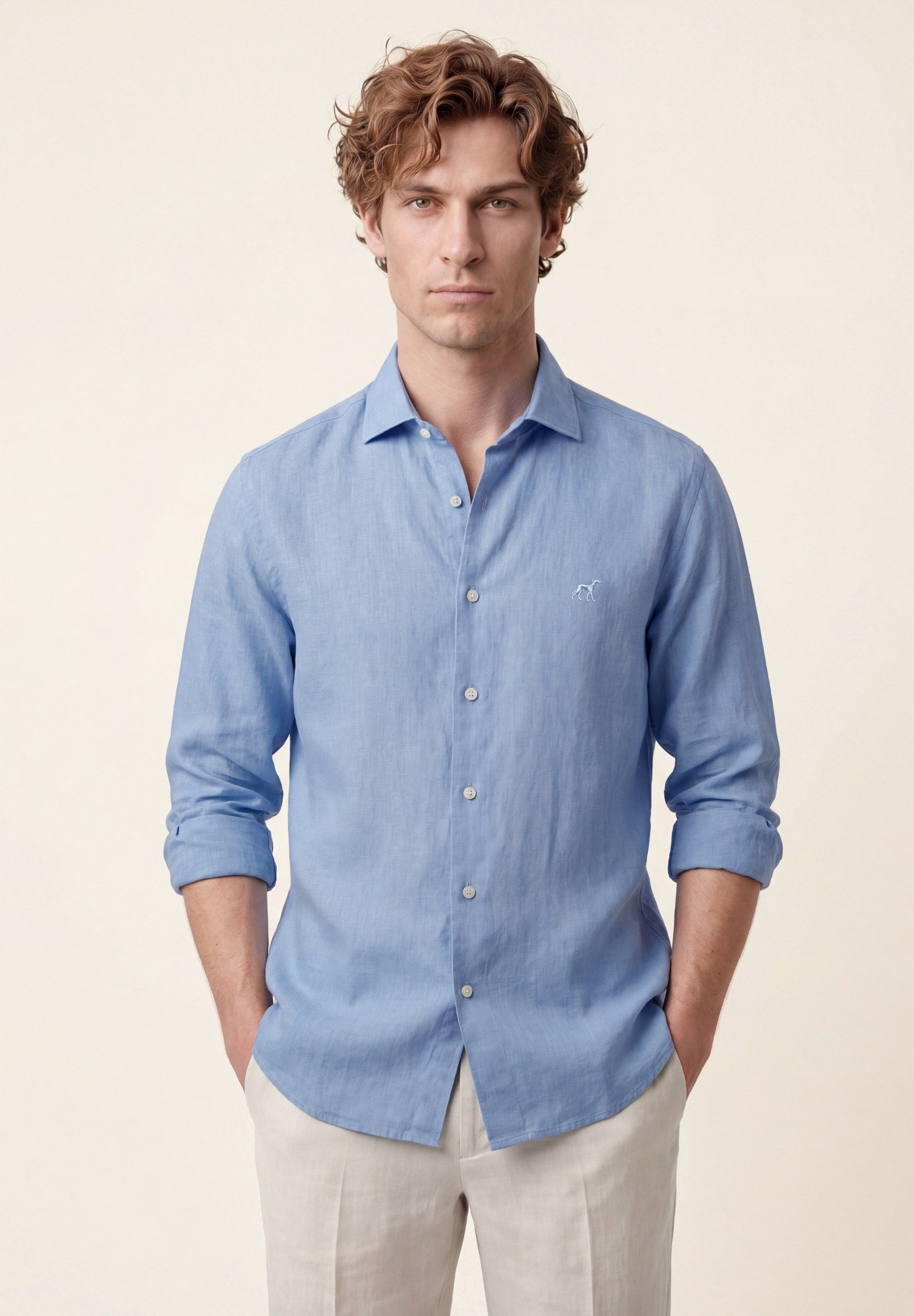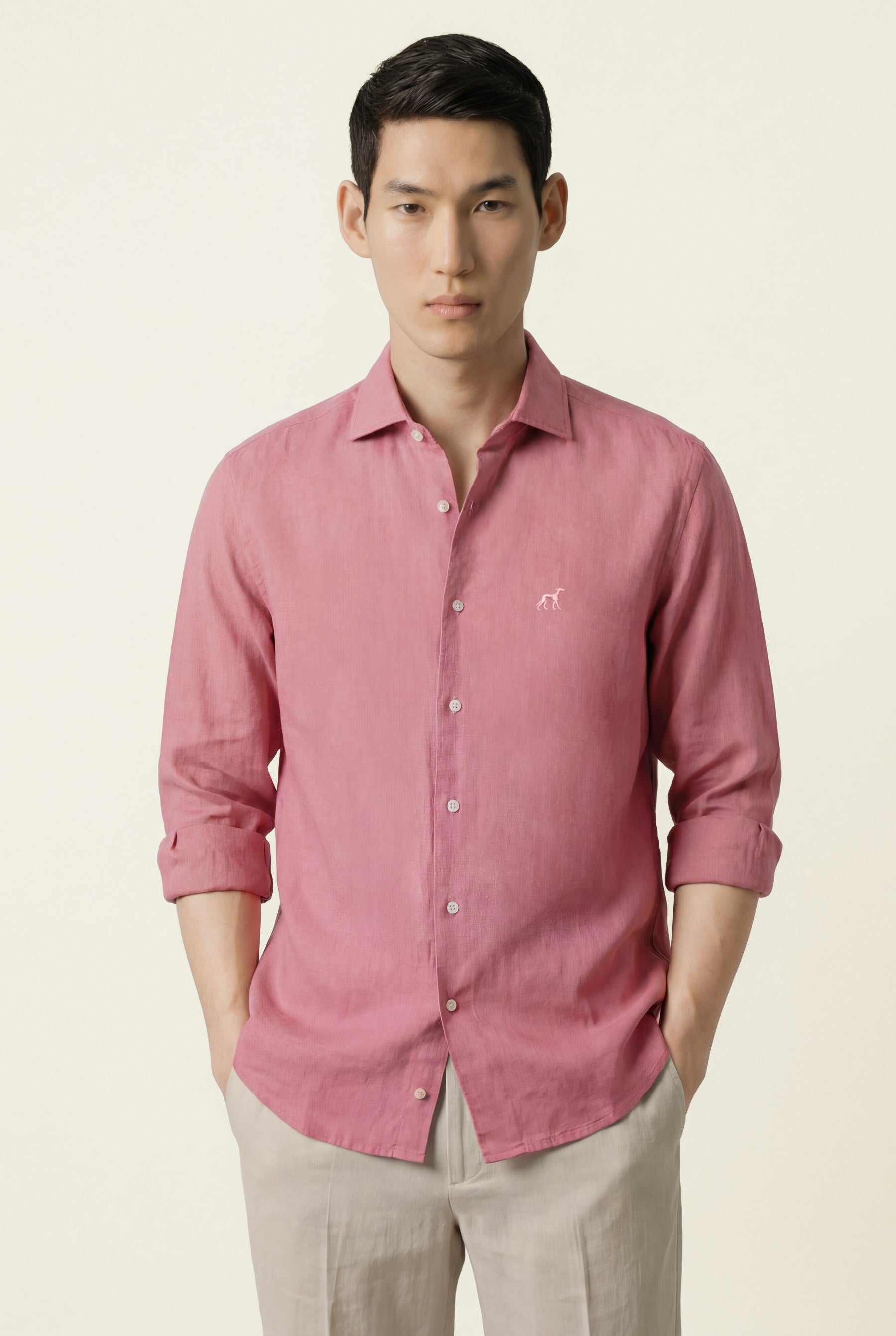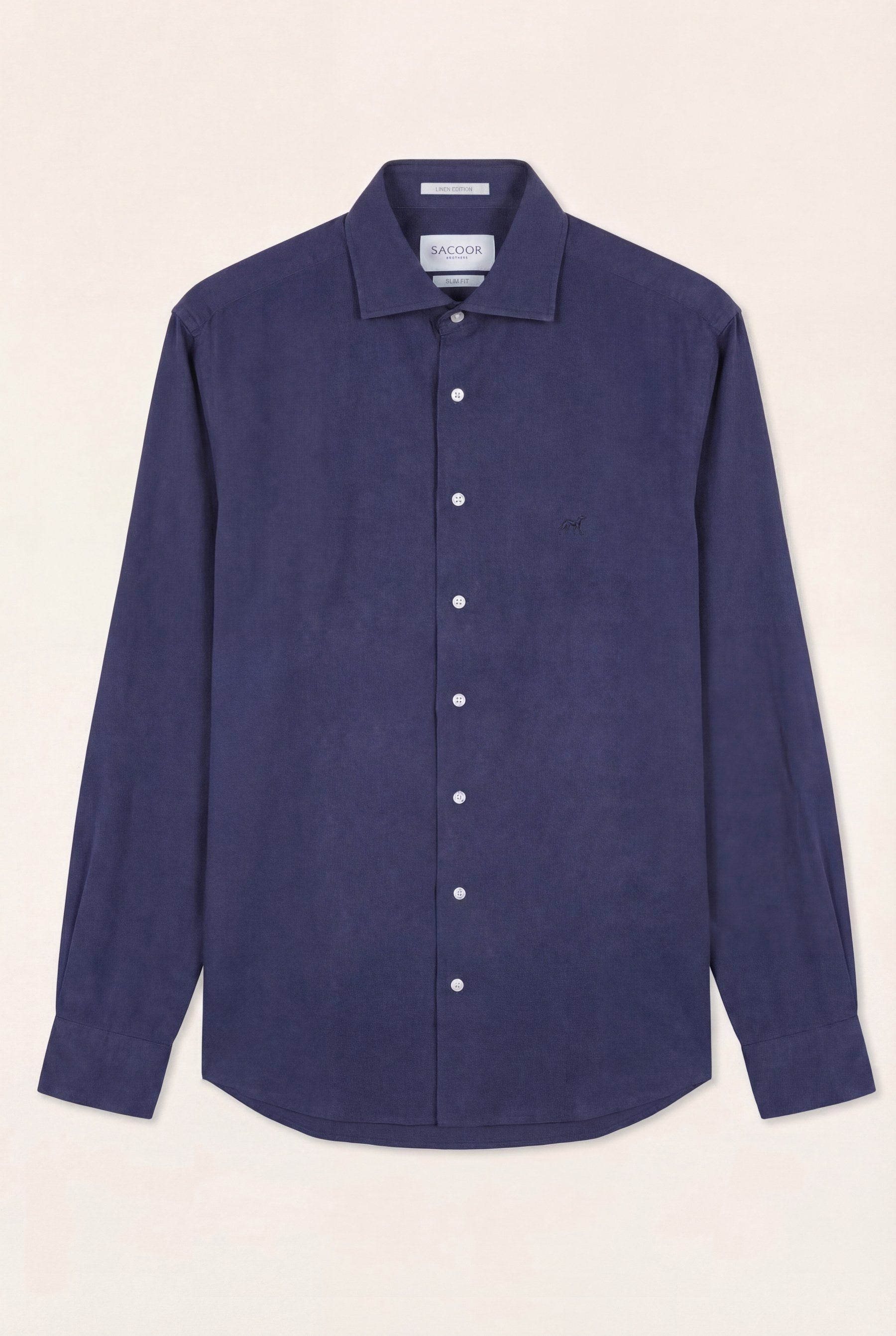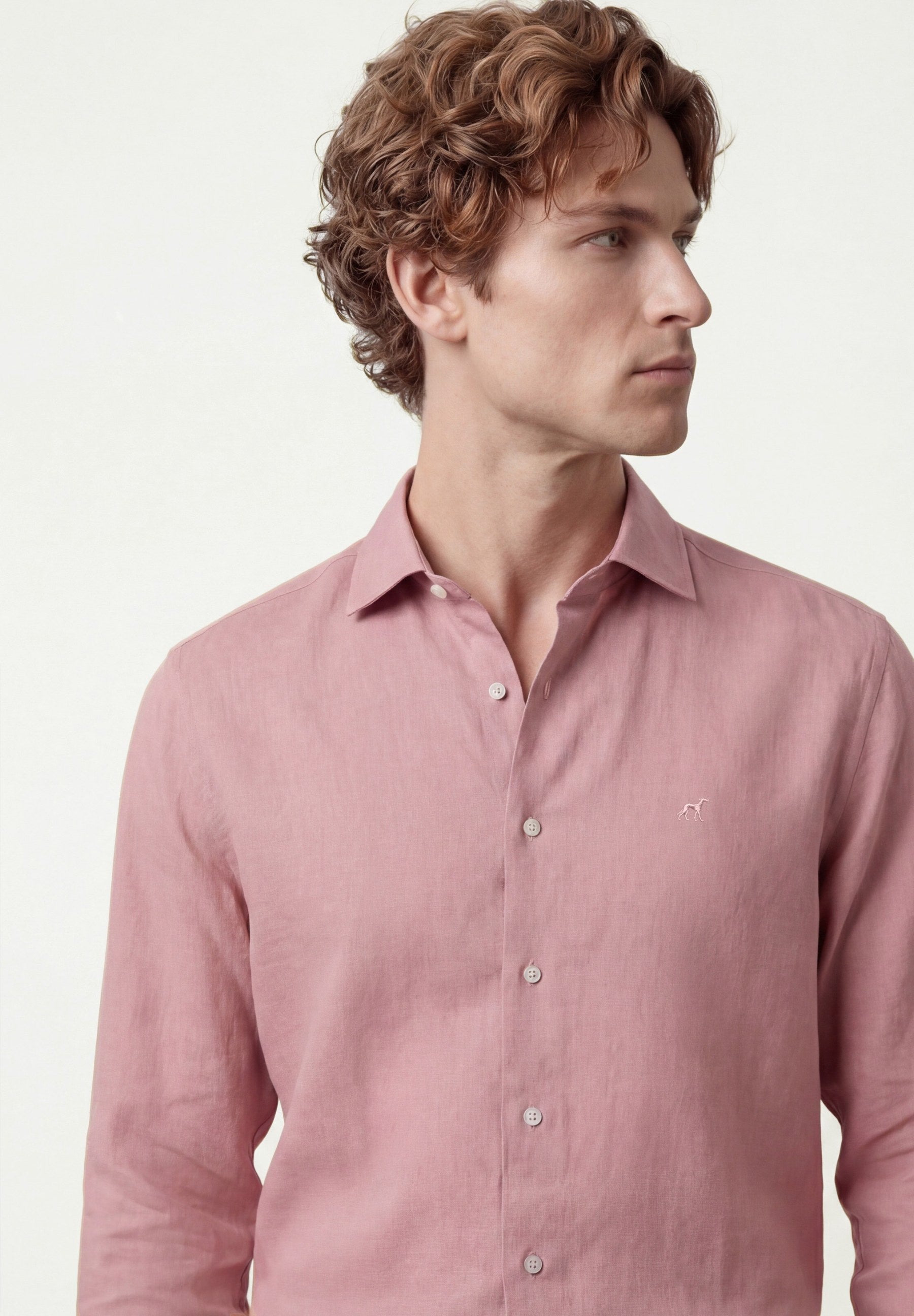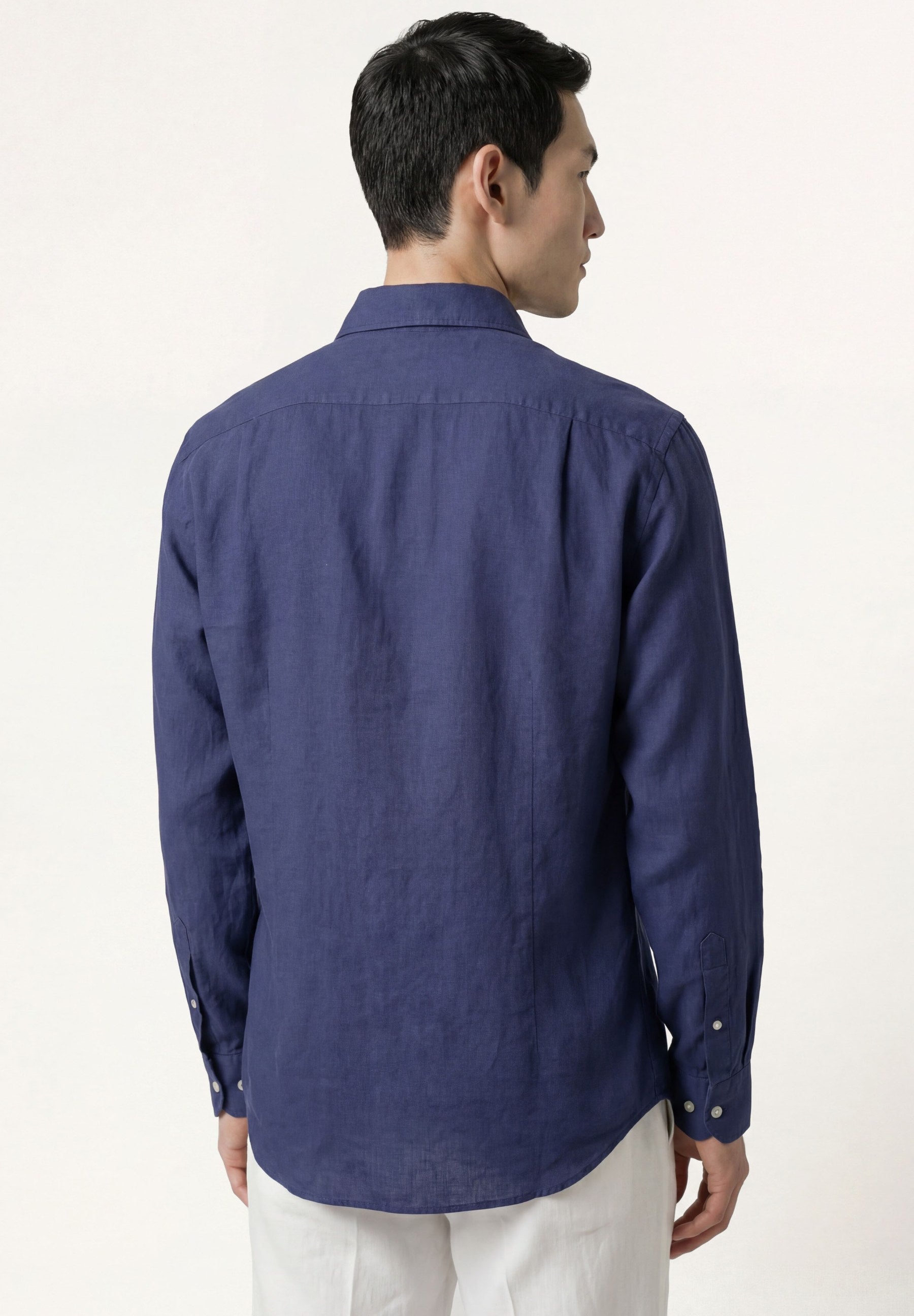 Camisa em algodão e linho, garment dyed, colarinho aberto, slim fit