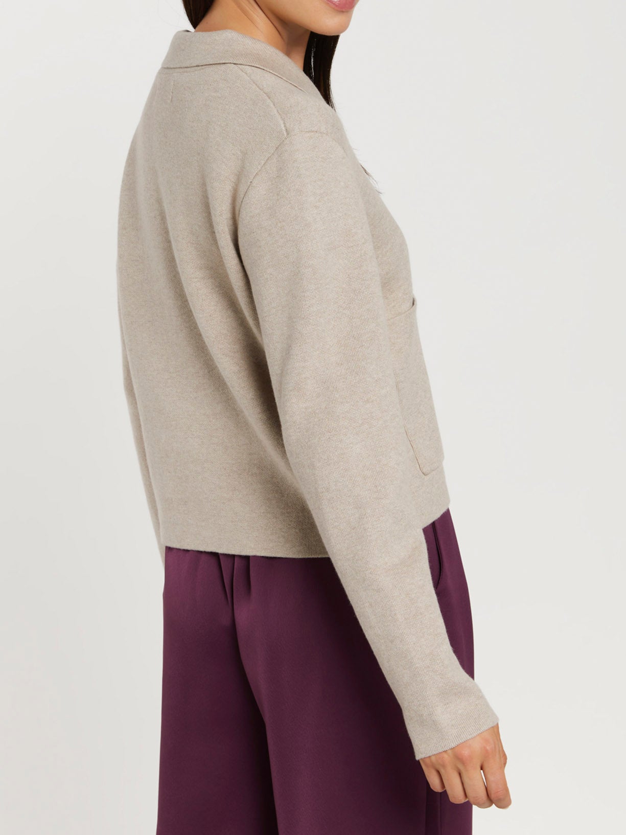 Casaco estruturado em malha regular fit. Possui formato quadrado, mangas longas com ombros descaídos e bolsos frontais. Gola abotoada com botões de cristal sofisticados para um visual mais sofisticado.