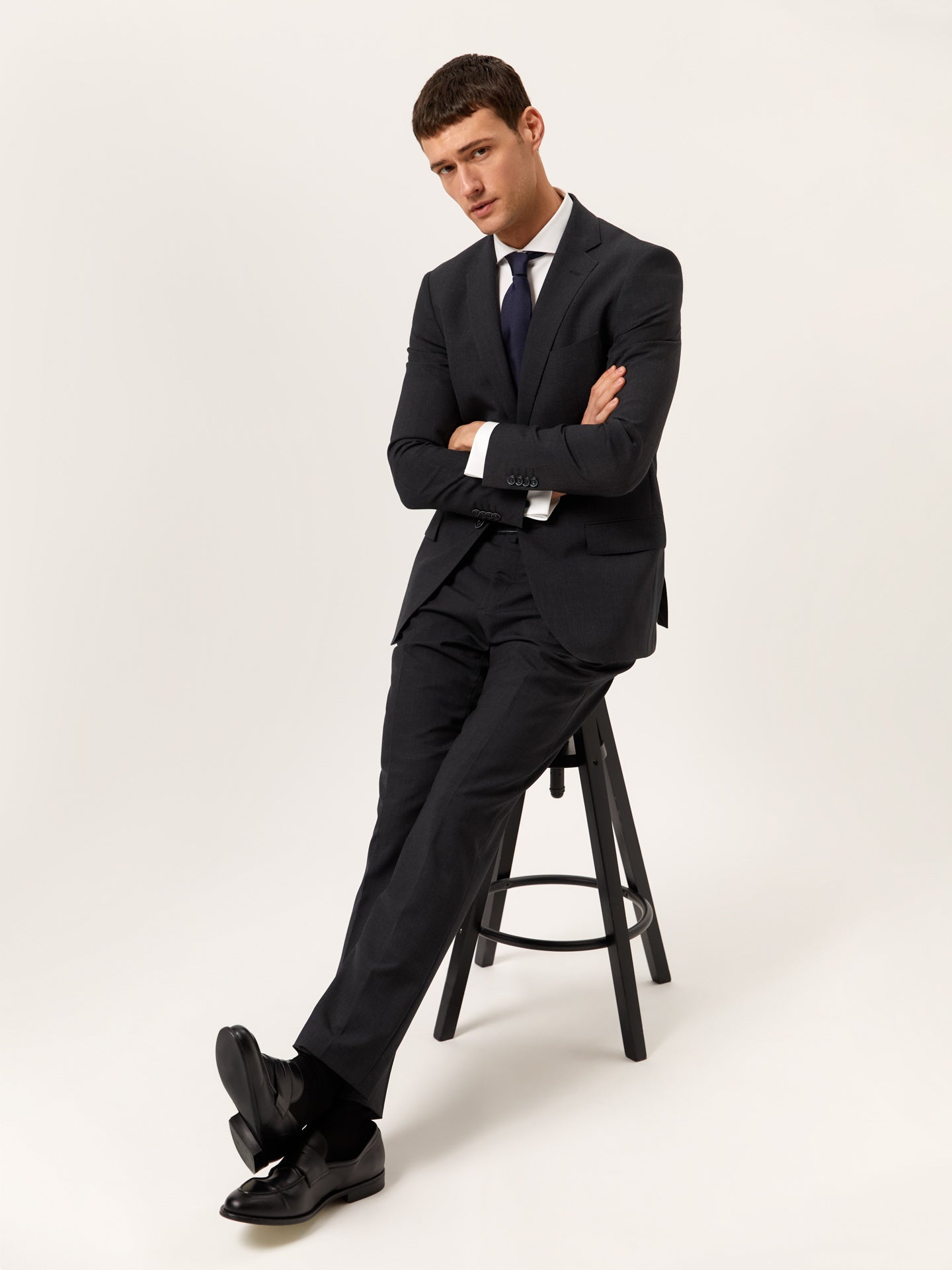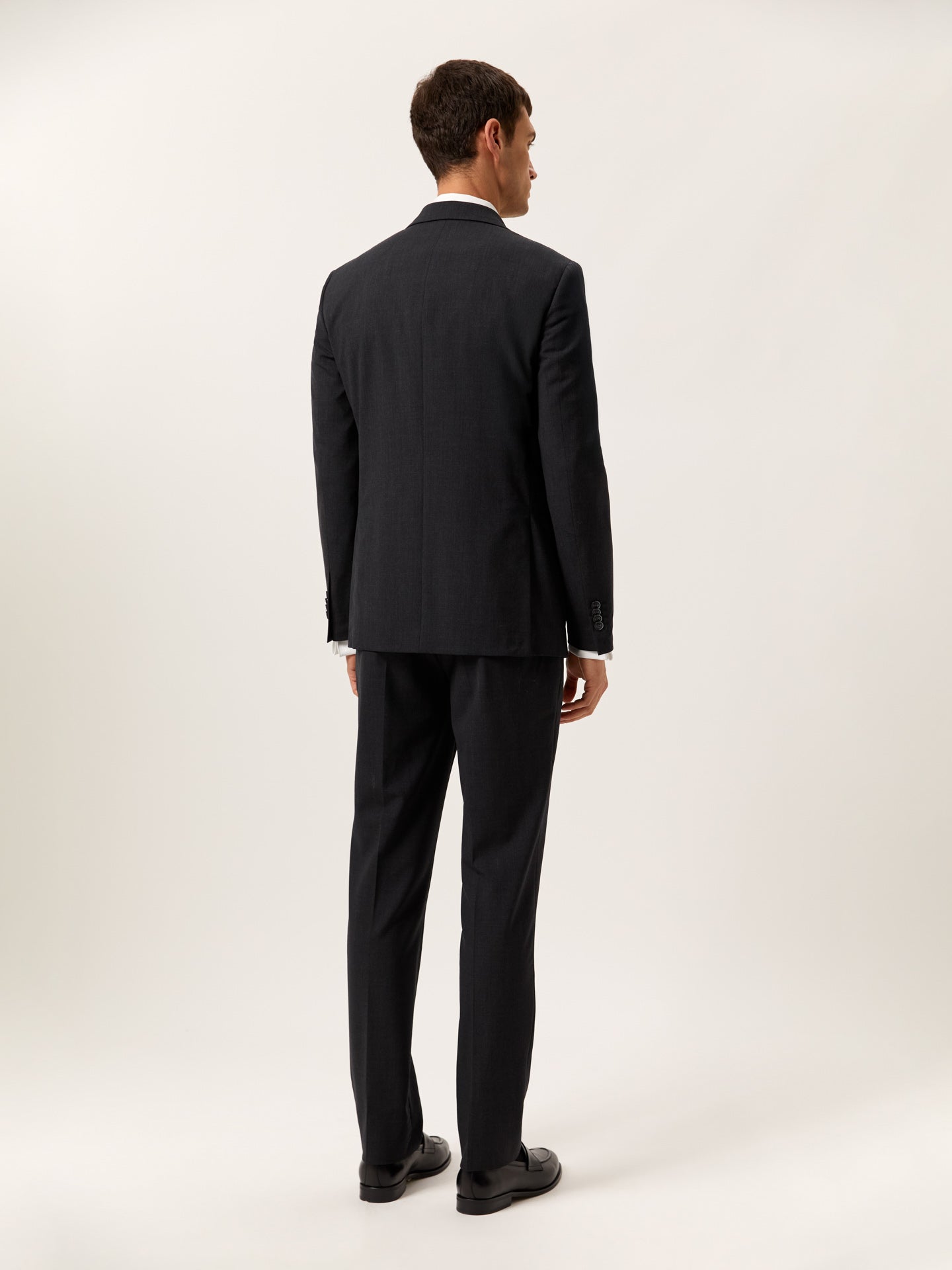 Uma peça distinta que conjuga elegância intemporal com versatilidade contemporânea. Cuidadosamente confecionado em lã de alta performance com elastano, este fato de duas peças oferece um conforto excecional, ajuste perfeito e desempenho superior. Os fios premium garantem maior elasticidade, respirabilidade e resistência a vincos, tornando-o ideal para o dia a dia exigente. Com um corte slim que proporciona uma silhueta descontraída e elegante, adapta-se a diferentes tipos de corpo. O blazer de dois botões apresenta lapelas em bico, bolsos com pala, punhos com quatro botões, duas aberturas traseiras, bolsos interiores com fecho de correr e um bolso com proteção EMW. As calças incluem fecho de correr com botão e colchete oculto, dois bolsos laterais com bolso para moedas, dois bolsos traseiros com debrum e presilhas para cinto. Disponível em medidas de corte regular, do tamanho 56 ao 62. Ideal para ambientes profissionais ou ocasiões em que a apresentação é essencial. Um fato para todas as ocasiões — uma escolha sofisticada que eleva qualquer guarda-roupa.