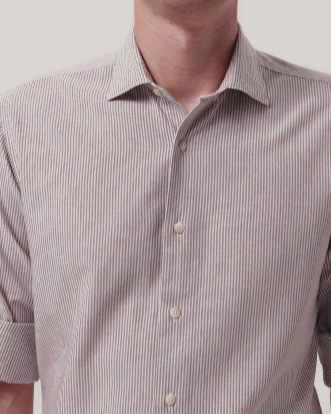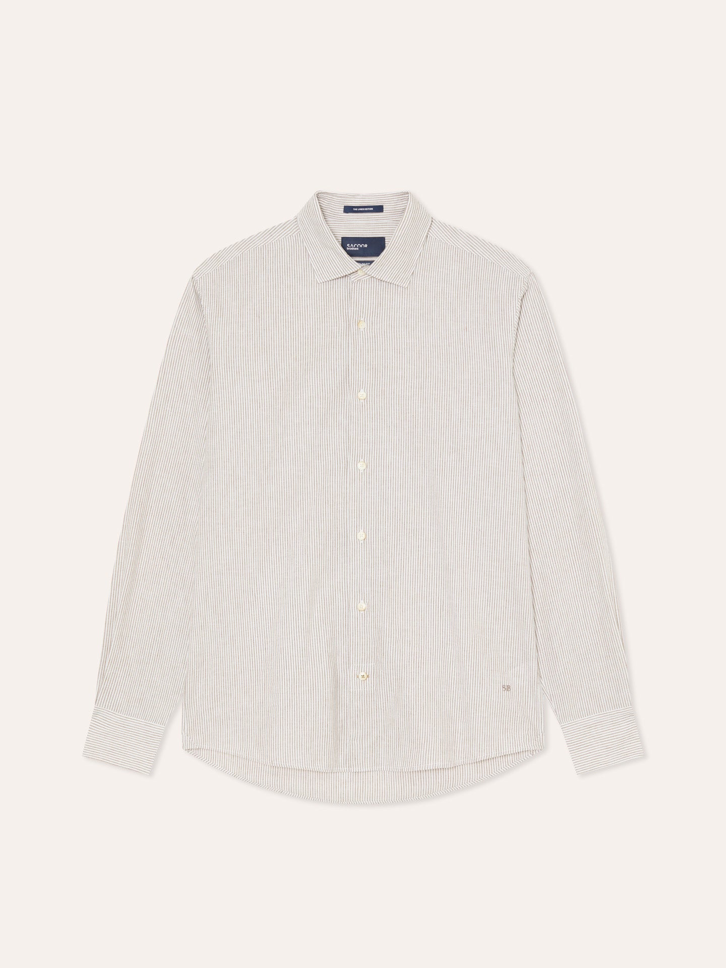 Introducing the striped shirt —crafted from high-quality cotton-linen blend, this shirt offers a soft, breathable feel, perfect for both comfort and style. This shirt combines the natural comfort of cotton with the refreshing texture of linen, offering a sophisticated yet relaxed fit ideal for elevated casual occasions. The slim fit provides a tailored silhouette that flatters the figure, while the open collar and front button-up fastening give it a contemporary and refined look. Long sleeves with single cuffs and two buttons enhance the shirt’s sleek design, while the chest logo embroidery in matching fabric adds a distinctive touch. An essential addition to any wardrobe, this shirt seamlessly blends style with comfort, exuding an effortless yet premium appeal.