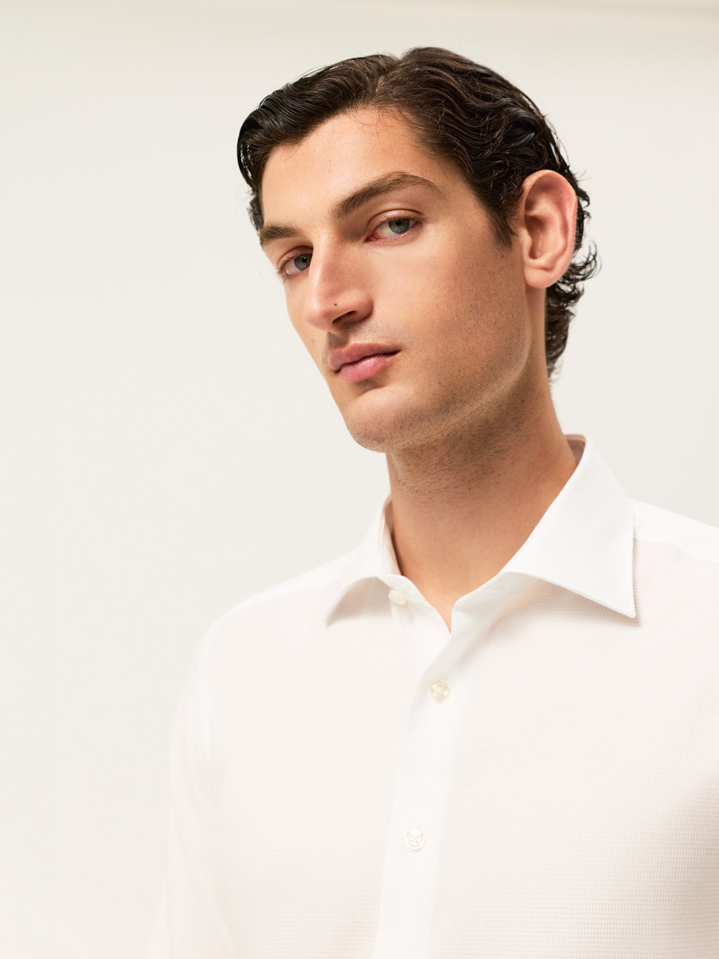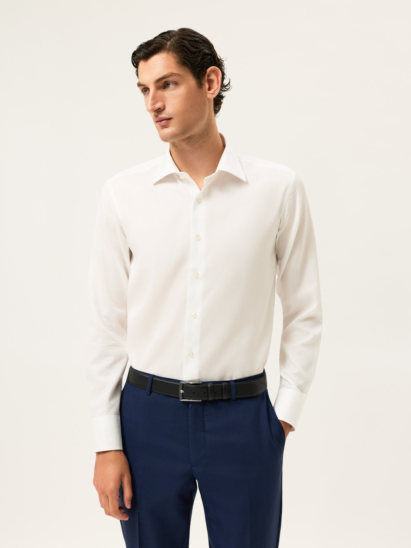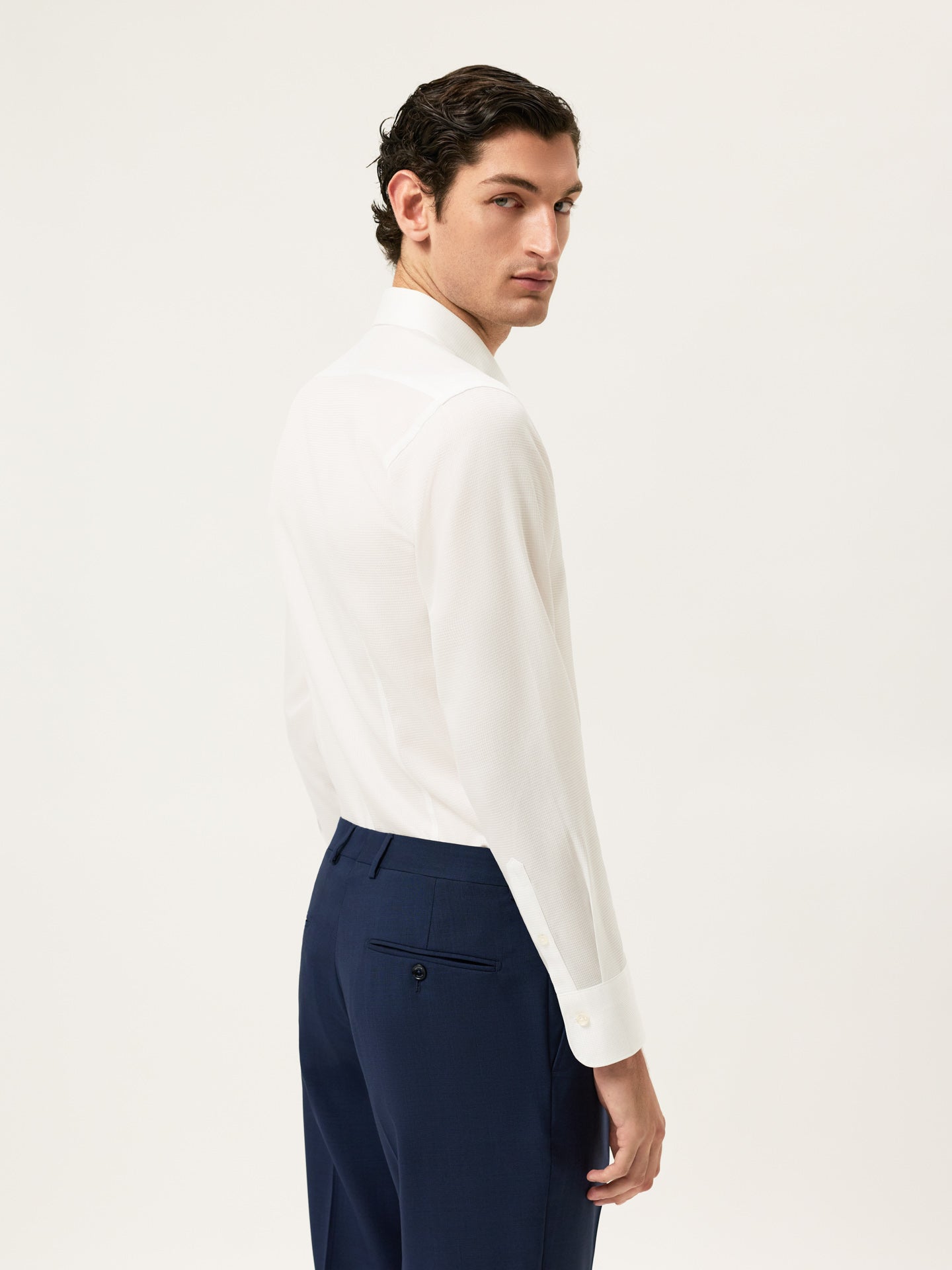This long-sleeve shirt is cut in a slim fit from cotton fabric with a refined dobby pattern, offering lightweight comfort, refined structure, and subtle texture. It features an Oxford collar, single placket, and standard cuffs. The shirt includes a discreet pleat on the sleeve, triangle inserts at the side seams in self-fabric, a horizontal last buttonhole in contrast thread, and off-white buttons. Detailed with removable collar stays and reinforced construction for durability. Available in regular fit sizes starting from size 44. This shirt is perfect for office wear and any occasion where a sharp look matters.