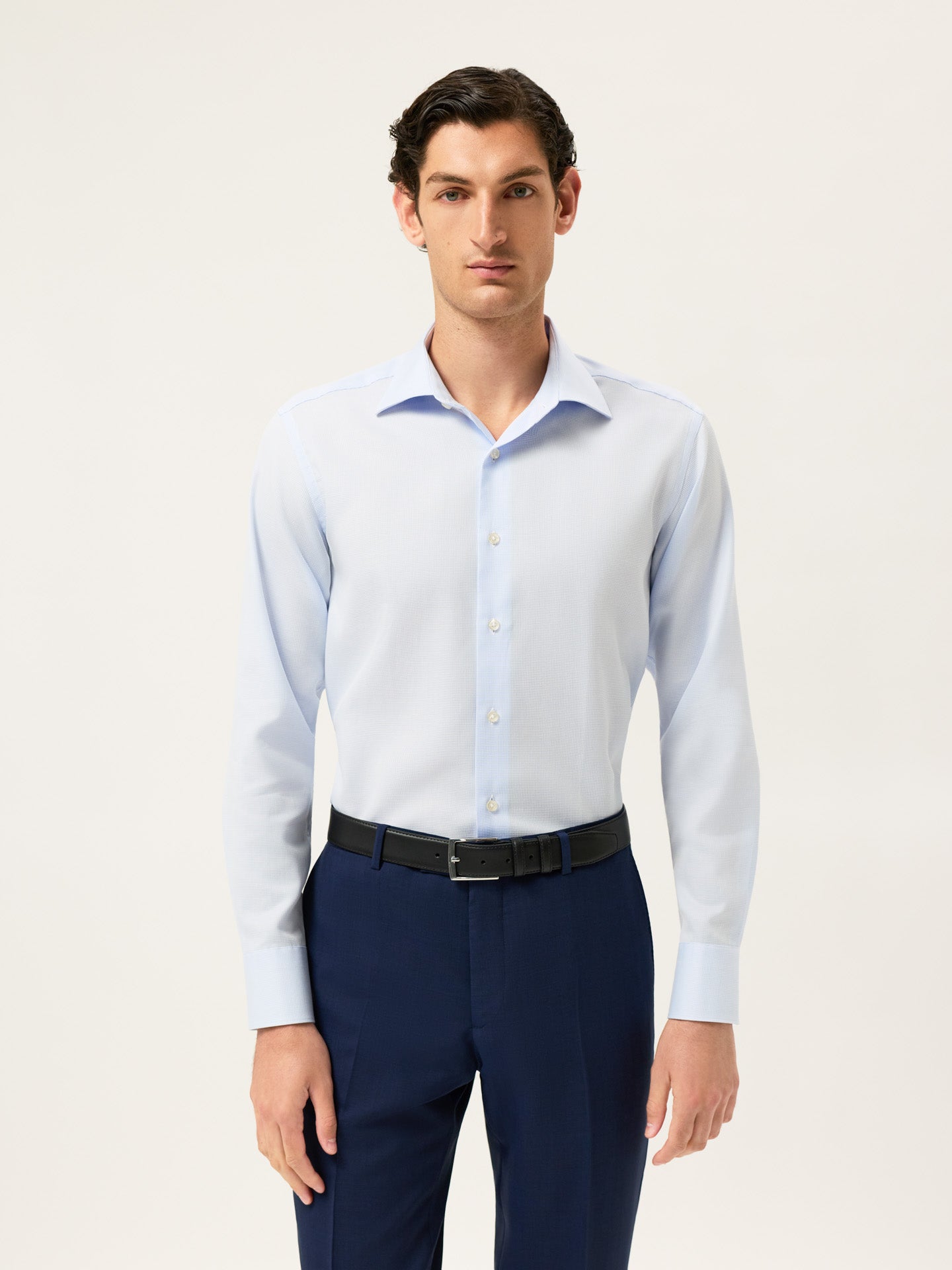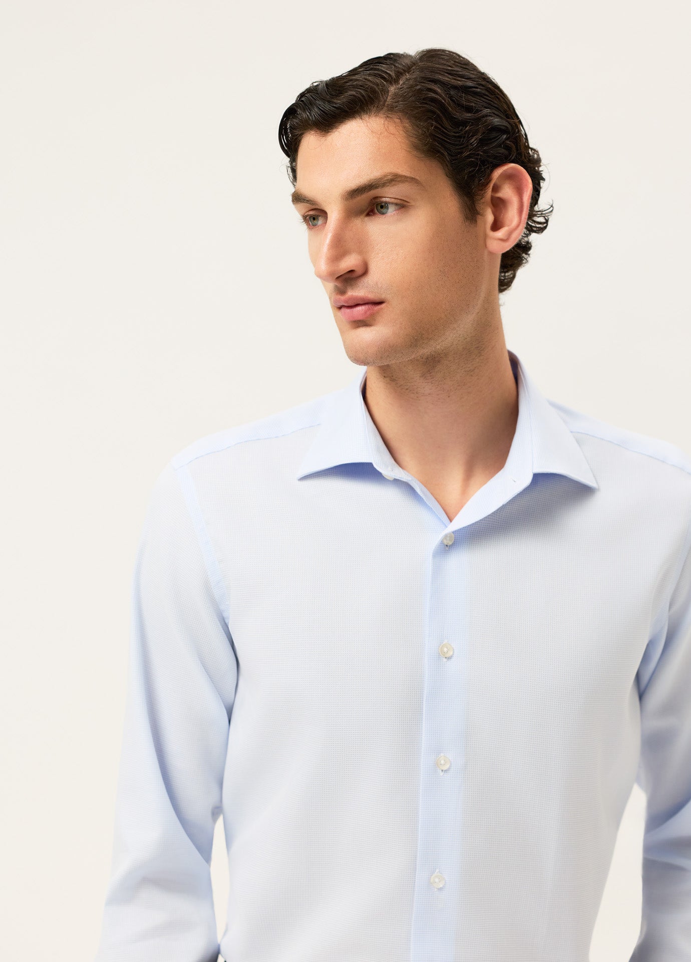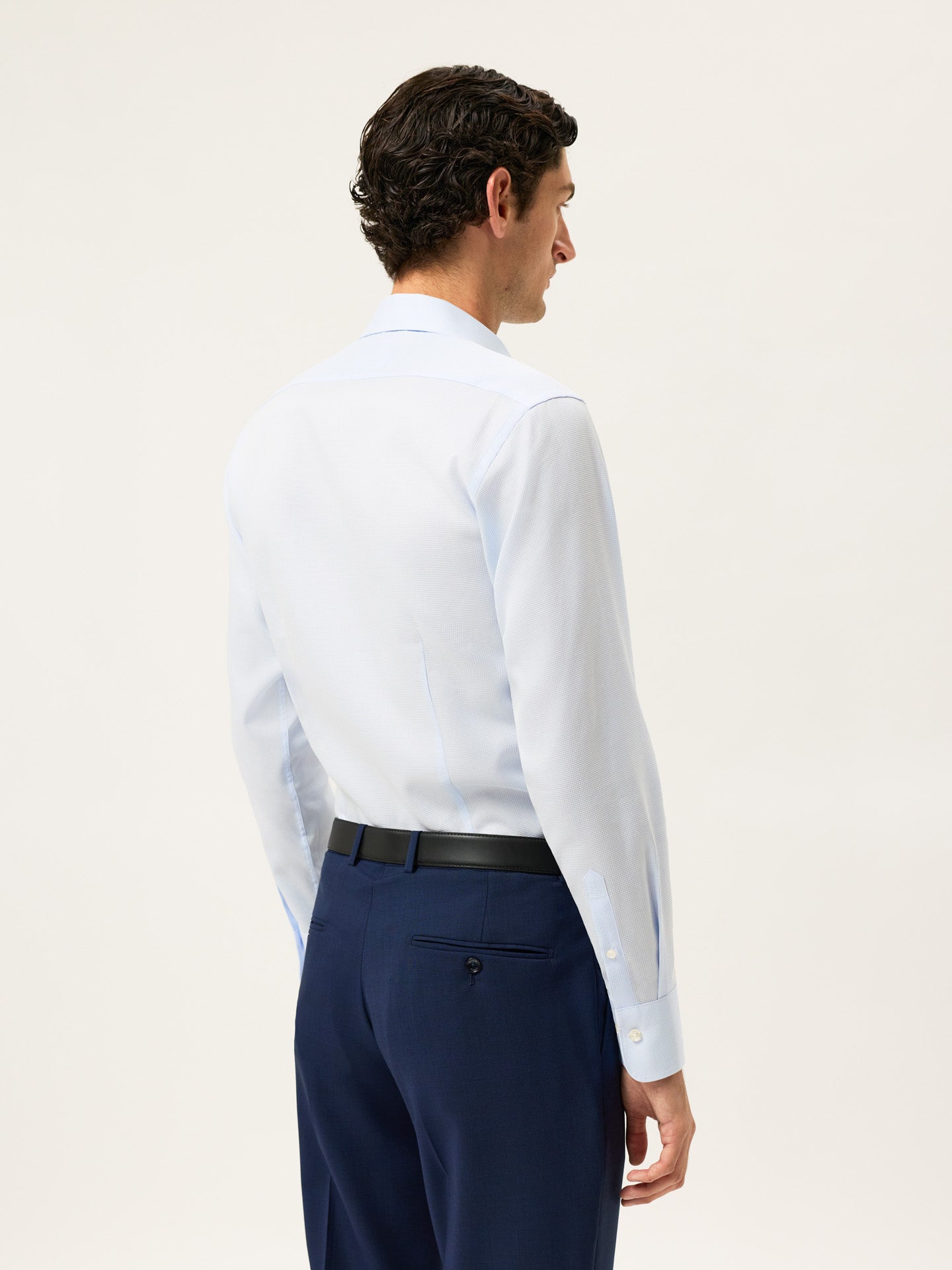 This long-sleeve shirt is cut in a slim fit from cotton fabric with a refined dobby pattern, offering lightweight comfort, refined structure, and subtle texture. It features an Oxford collar, single placket, and standard cuffs. The shirt includes a discreet pleat on the sleeve, triangle inserts at the side seams in self-fabric, a horizontal last buttonhole in contrast thread, and off-white buttons. Detailed with removable collar stays and reinforced construction for durability. Available in regular fit sizes starting from size 44. This shirt is perfect for office wear and any occasion where a sharp look matters.