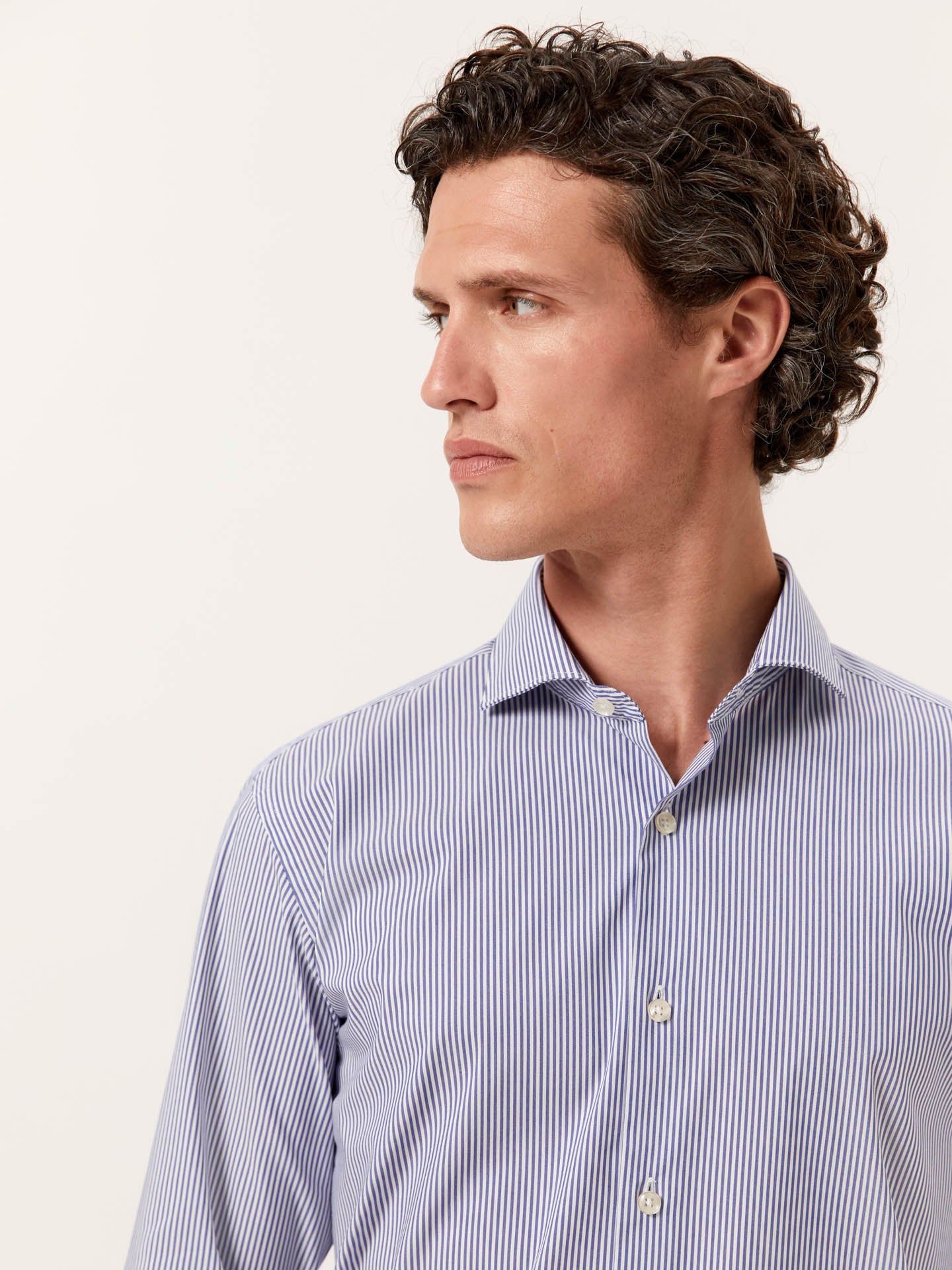 Crafted from a premium cotton blend, this slim-fit shirt features light blue stripes that seamlessly combine contemporary style with advanced comfort. The striped pattern adds a refined and modern touch, while the comfort cotton poplin fabric, enriched with polyester and spandex fibers, ensures optimal elasticity, breathability, and a refined sheen. The LIQUID AMMONIAC FINISHING provides a soft, smooth feel to the fabric while enhancing its durability and resistance to wrinkles, ensuring a fresh, crisp look throughout the day. Designed with a Dublin collar and front button-up fastening, this shirt offers a modern and polished look. The single cuffs, featuring two buttons, provide a comfortable and adjustable fit, while side gussets in self-fabric add durability and a subtle touch of craftsmanship. With regular fitting measurements from size 44, this business shirt exemplifies impeccable tailoring, innovative materials, and meticulous attention to detail. The perfect choice for those who seek versatility, ease of movement, and an elegant yet understated aesthetic in both professional and formal settings.