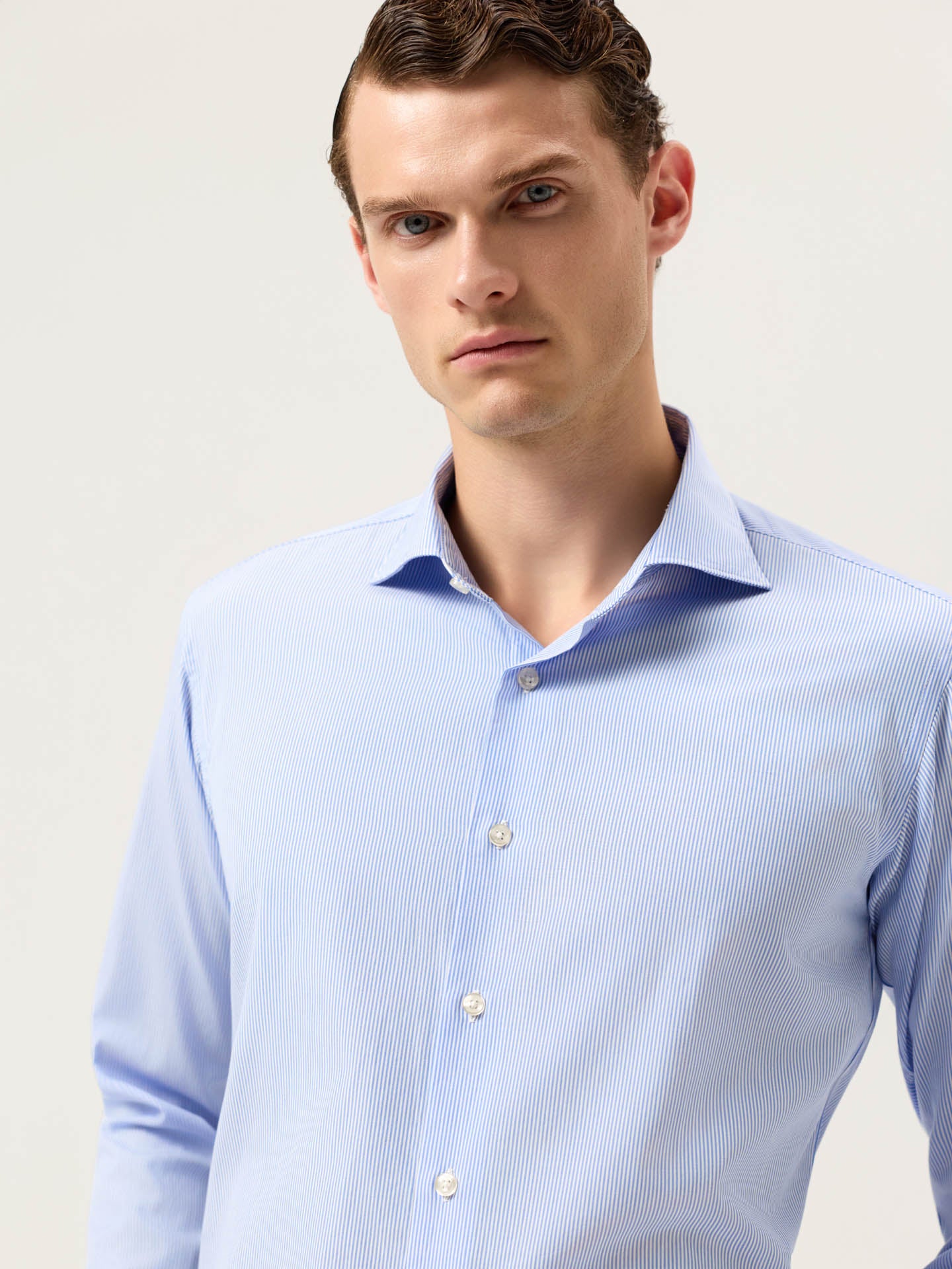 This long-sleeve shirt is cut in a slim fit from poplin fabric with a refined stripe pattern, offering lightweight comfort and refined structure. It features a Newport collar, single placket, and standard cuffs. The shirt includes a discreet pleat on the sleeve, triangle inserts at the side seams in self-fabric, a horizontal last buttonhole in contrast thread, and off-white buttons. Detailed with removable collar stays, and reinforced construction for durability. Available in regular fit sizes starting from size 44. This shirt is perfect for office wear and any occasion where a sharp look matters.