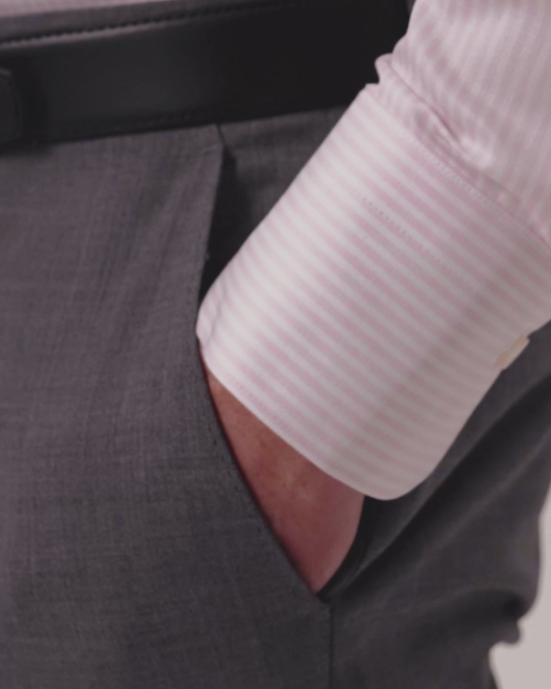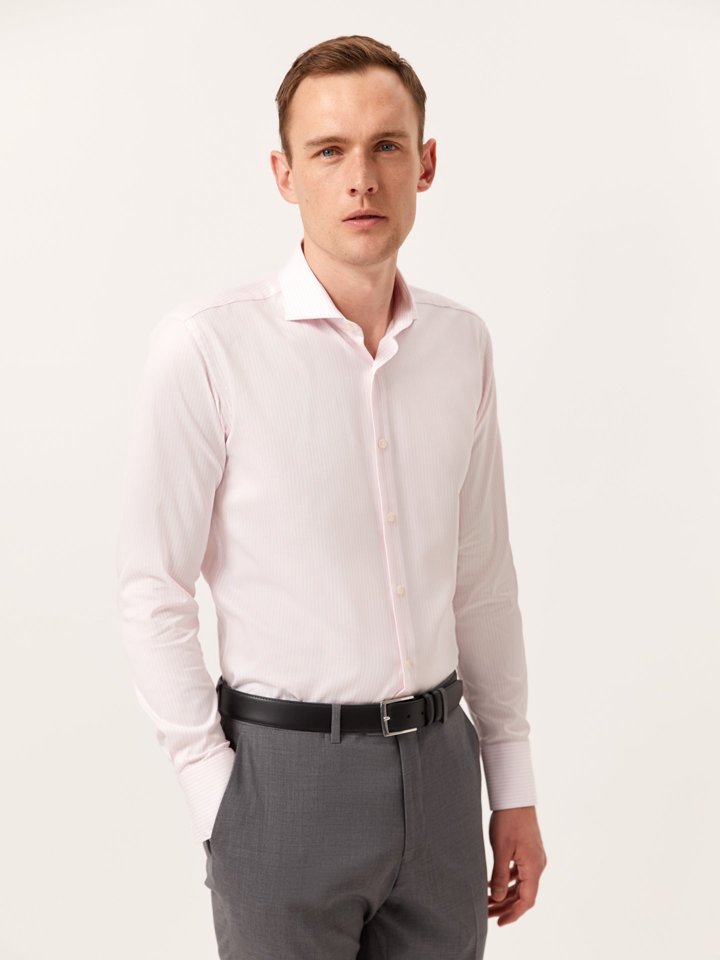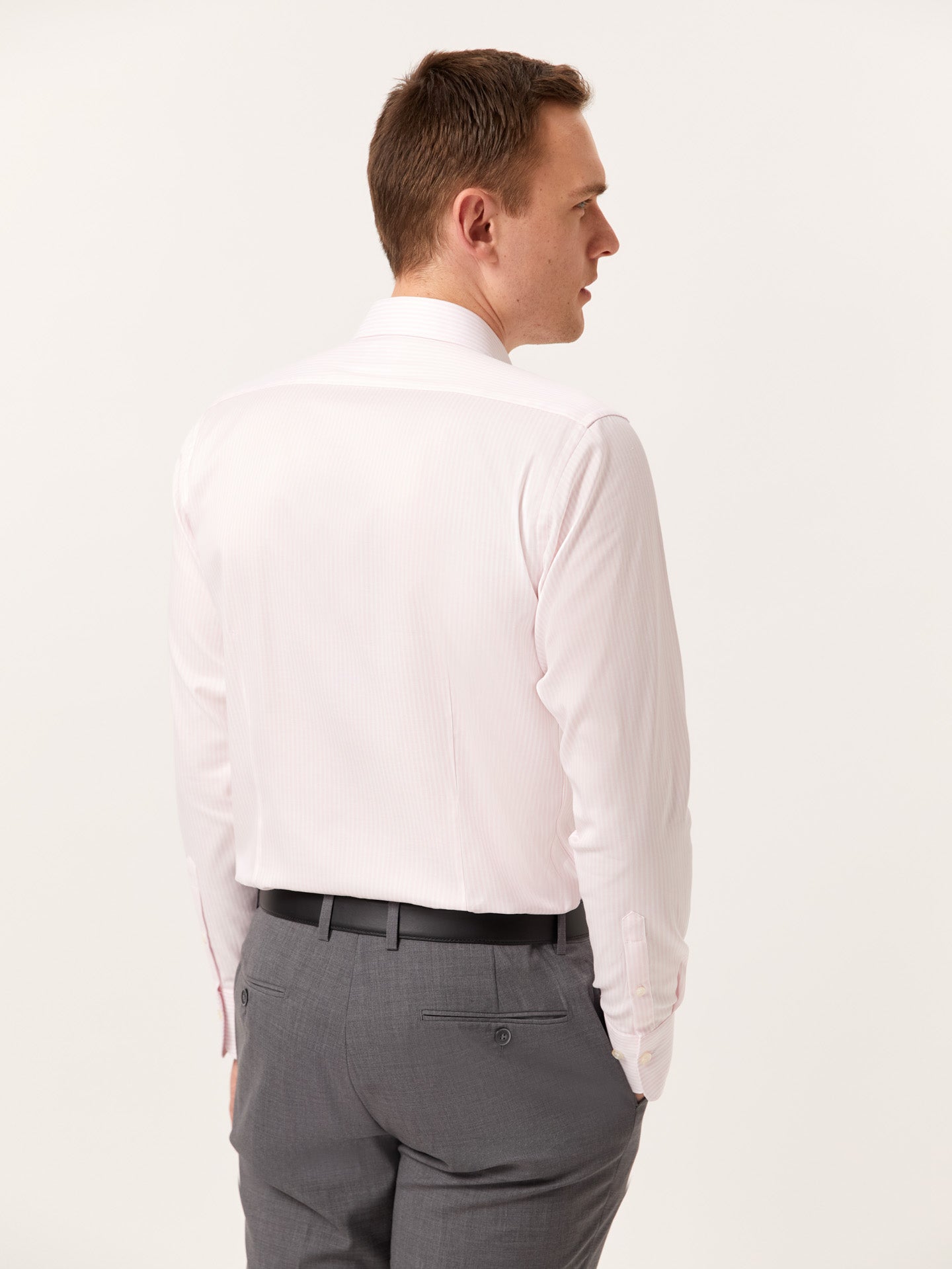 Crafted from 100% high-quality cotton, this slim-fit shirt in light pink stripes is the perfect choice for those seeking understated elegance with a modern twist. The striped pattern offers a refined, sophisticated finish, while the Dublin collar and front button-up fastening create a contemporary, polished look. Long sleeves with single cuffs and two buttons ensure both comfort and style. Side gussets in self-fabric provide subtle reinforcement and durability. With regular fitting measurements from size 44, this business shirt reflects impeccable craftsmanship, superior materials, and attention to detail. A timeless essential, it’s ideal for formal occasions where elegance, sophistication, and a flawless presentation are key.