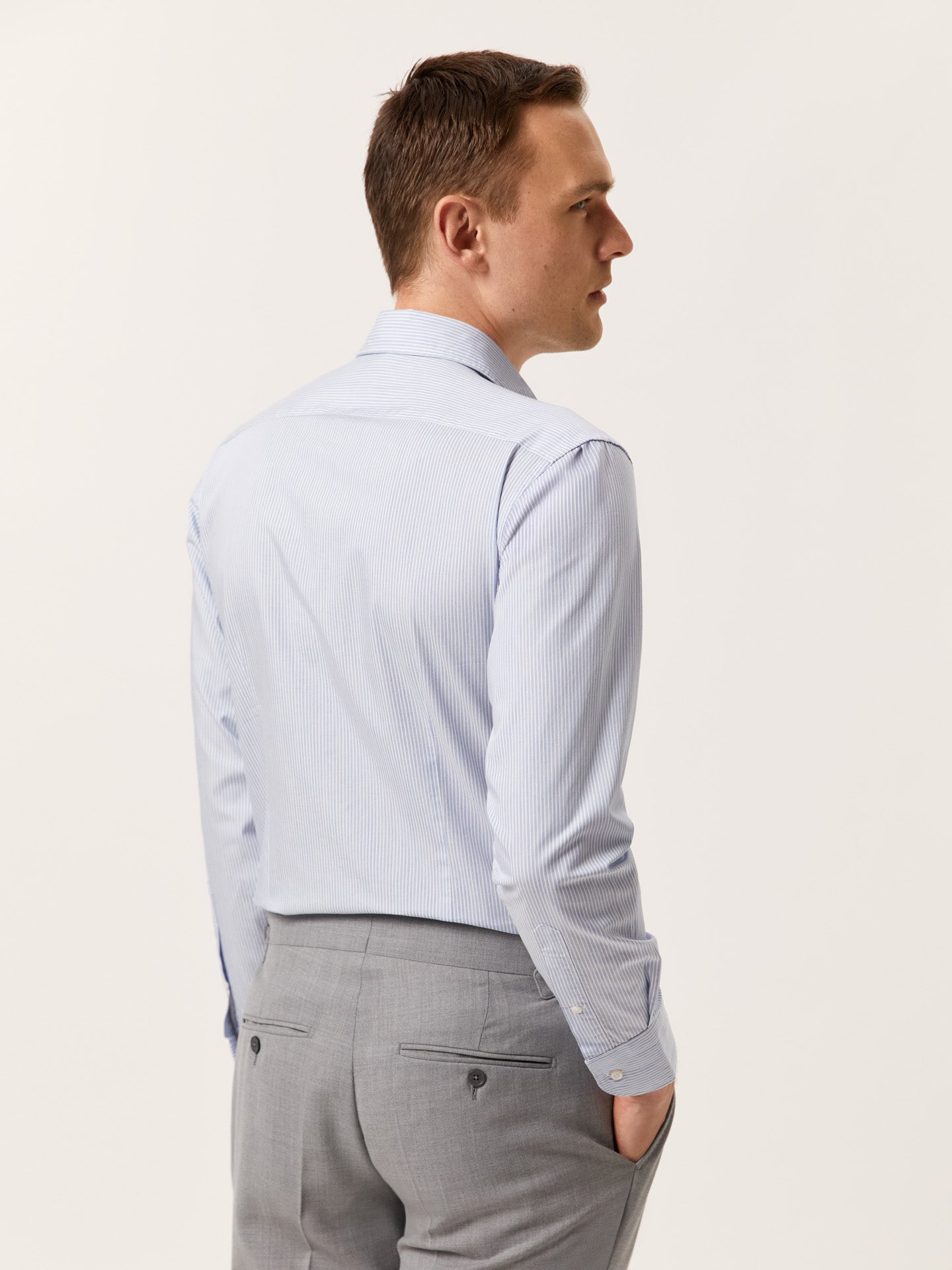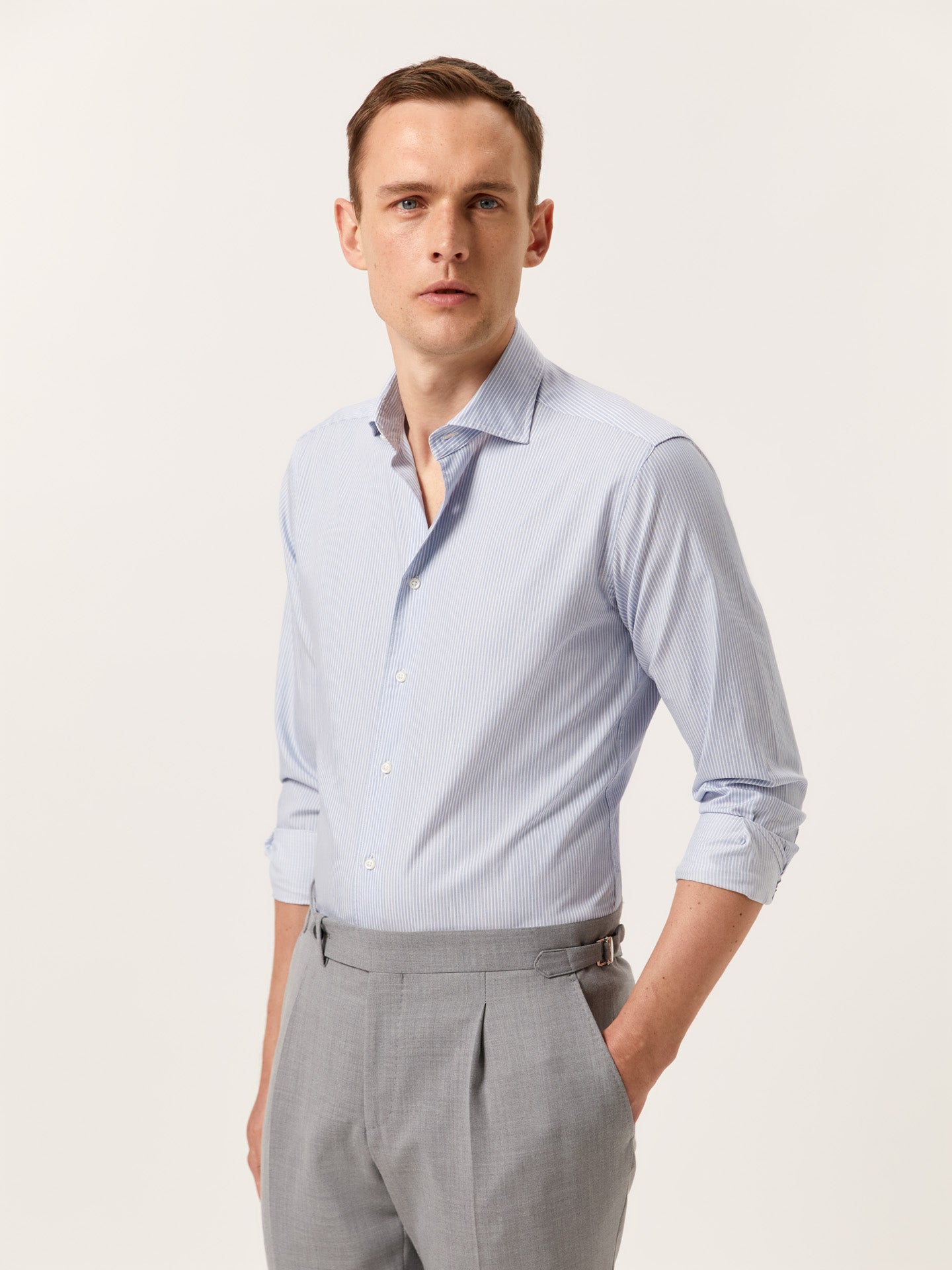 Introducing the NEW FORMAL washed shirt in striped satin twill—crafted from 100% high-quality cotton. This slim-fit shirt combines excellent quality with a naturally distressed look, offering a refined yet relaxed feel. The striped satin twill fabric provides a sophisticated finish with a subtle sheen, while the Newport collar and front button-up fastening add a contemporary, polished touch. Designed with long sleeves and single cuffs with one button, this shirt ensures both comfort and style. Side gussets in contrast fabric enhance durability and add a distinctive detail. With regular fitting measurements from size 44, this shirt is versatile enough for both formal and casual occasions. An essential piece in any wardrobe, this shirt reflects impeccable craftsmanship, superior materials, and thoughtful design, making it a must-have for those who appreciate style, sophistication, and effortless versatility.