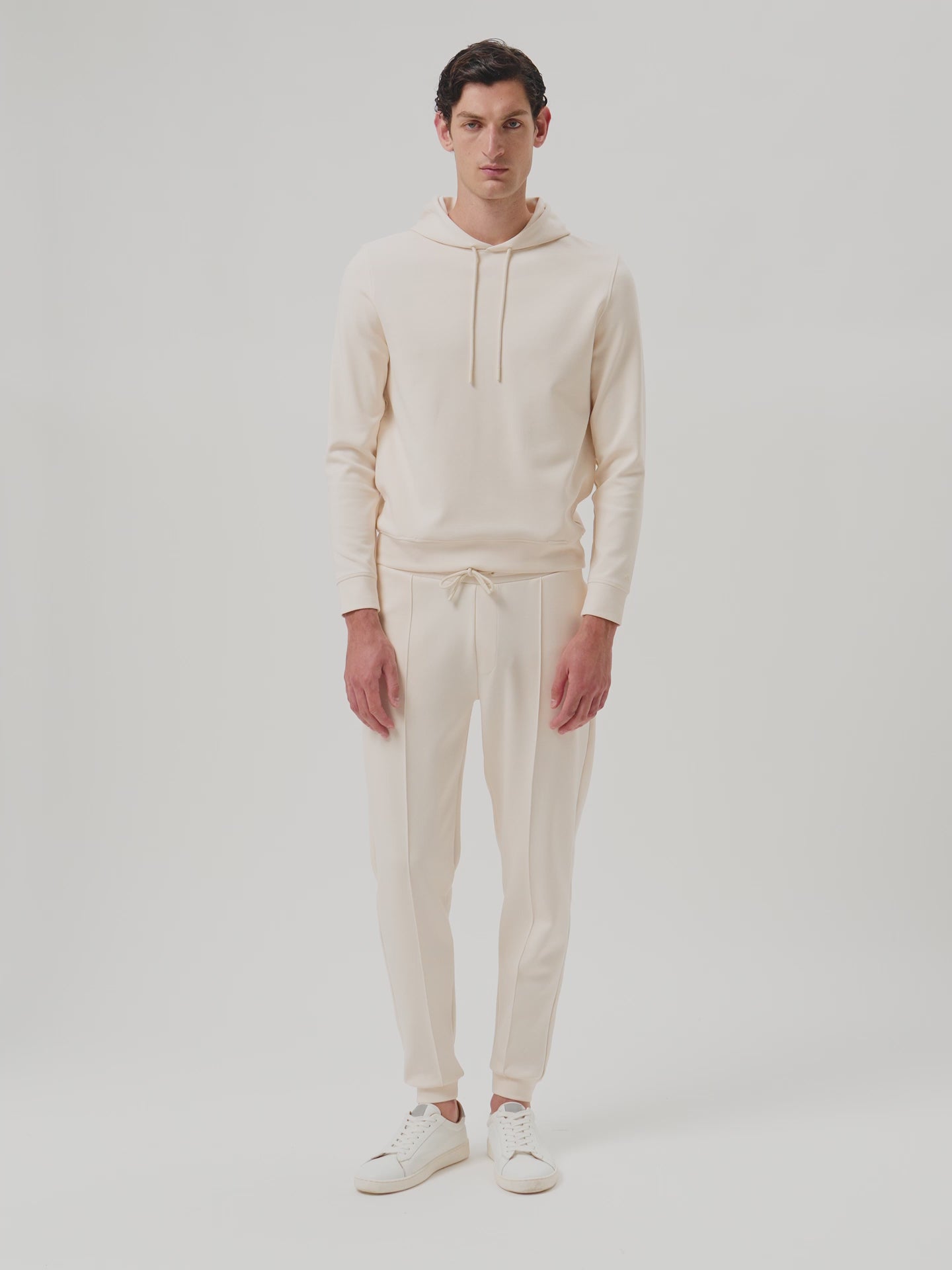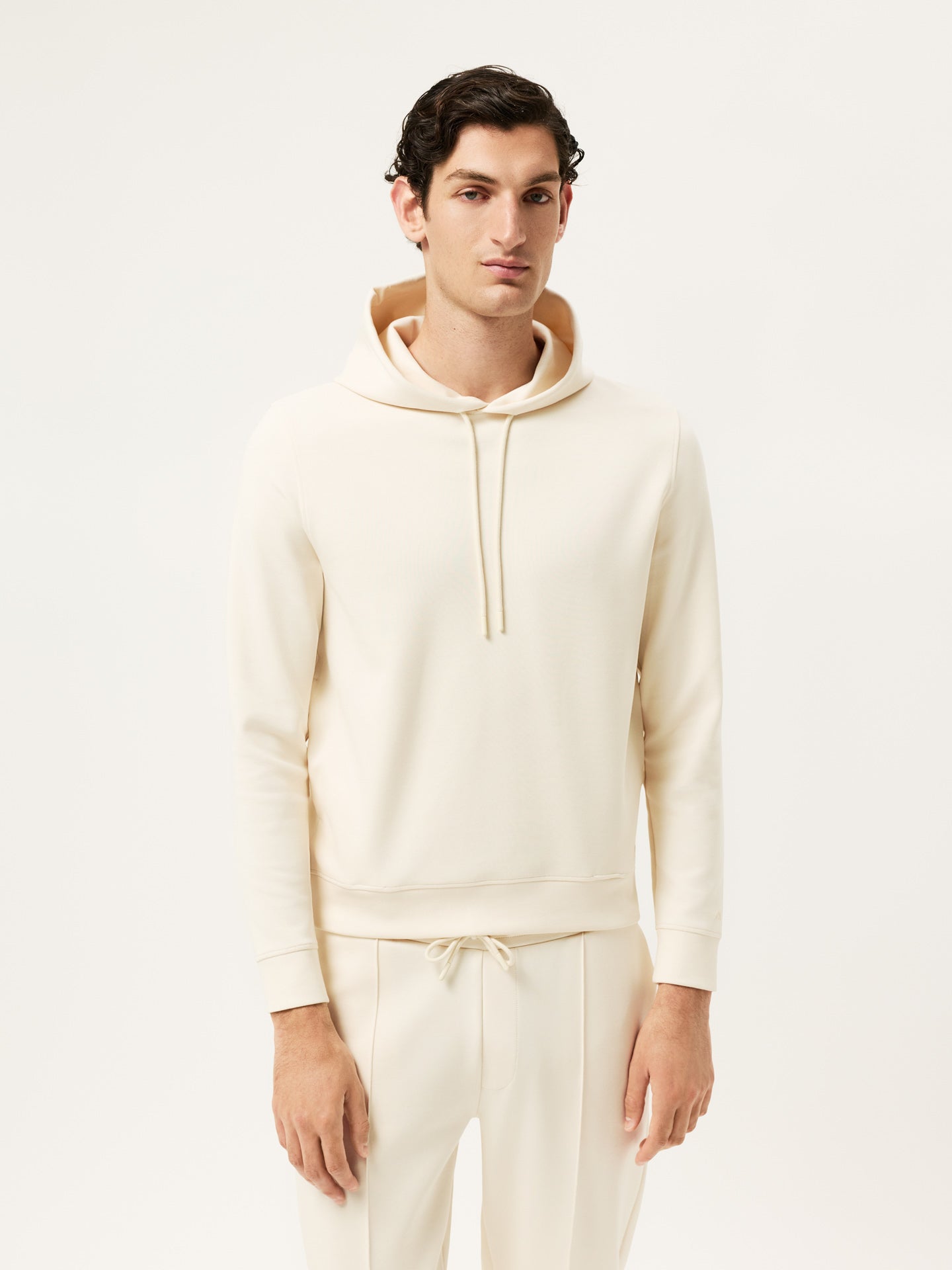 Made from a premium micromodal fleece blend, this hooded sweatshirt offers unmatched softness and natural stretch. It features a drawstring hood lined in jersey, tonal cord and eyelets, and inseam front pockets with reinforced bartacks. Ribbed hem and cuffs in self fabric ensure a clean silhouette. A high-relief Sacoor logo print on the sleeve and cotton canvas collar loop add elevated finishing touches. Designed with flatlock stitching at armholes and shoulders for durability and comfort.