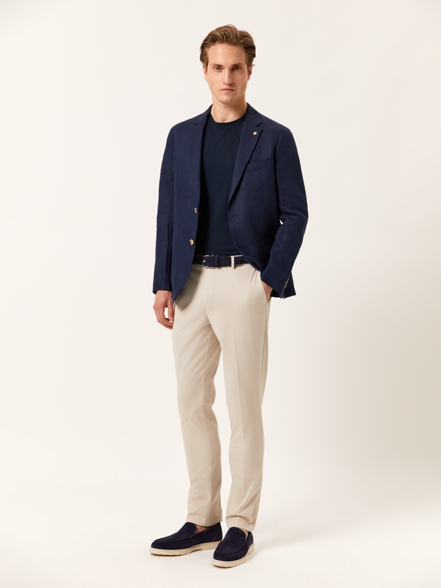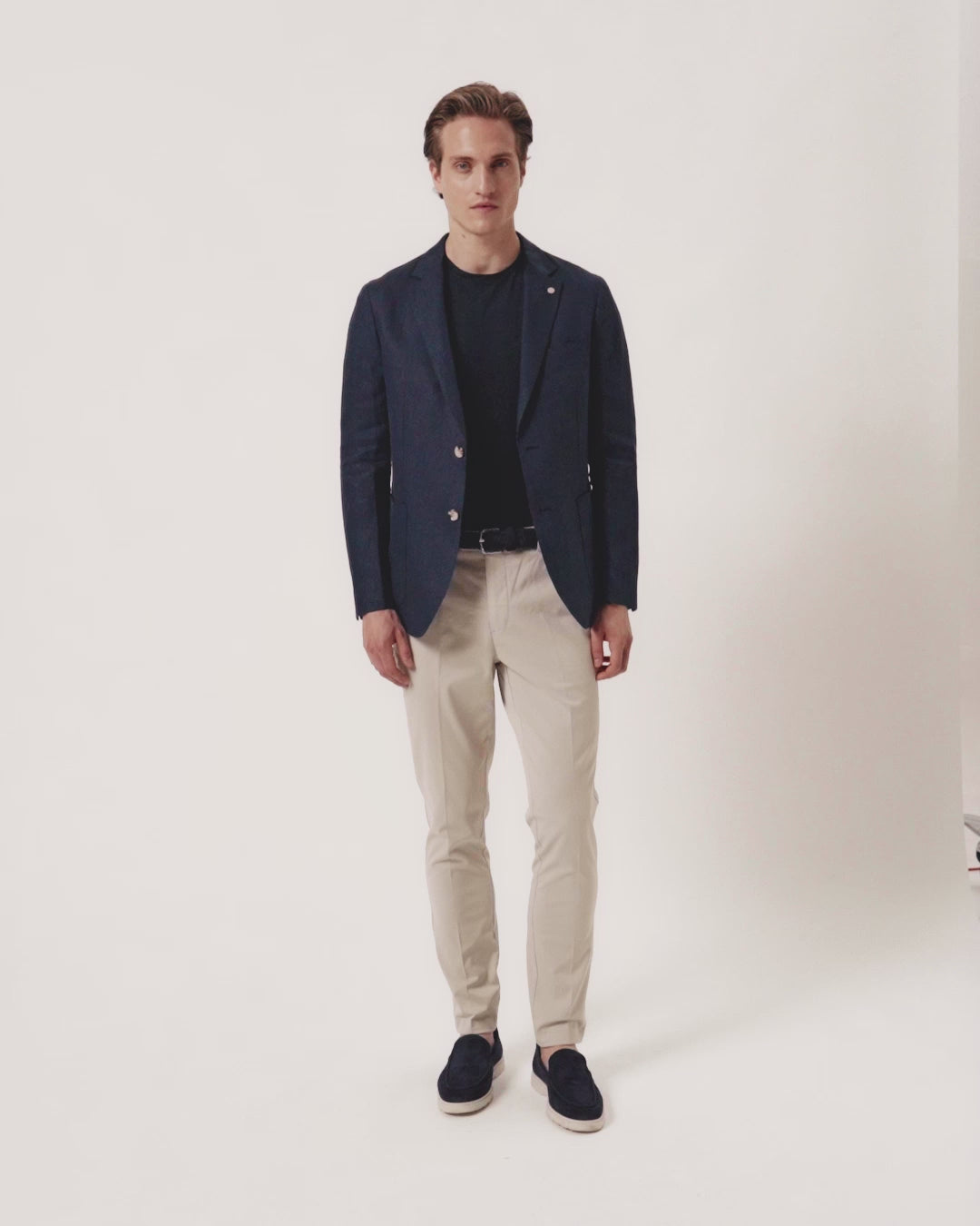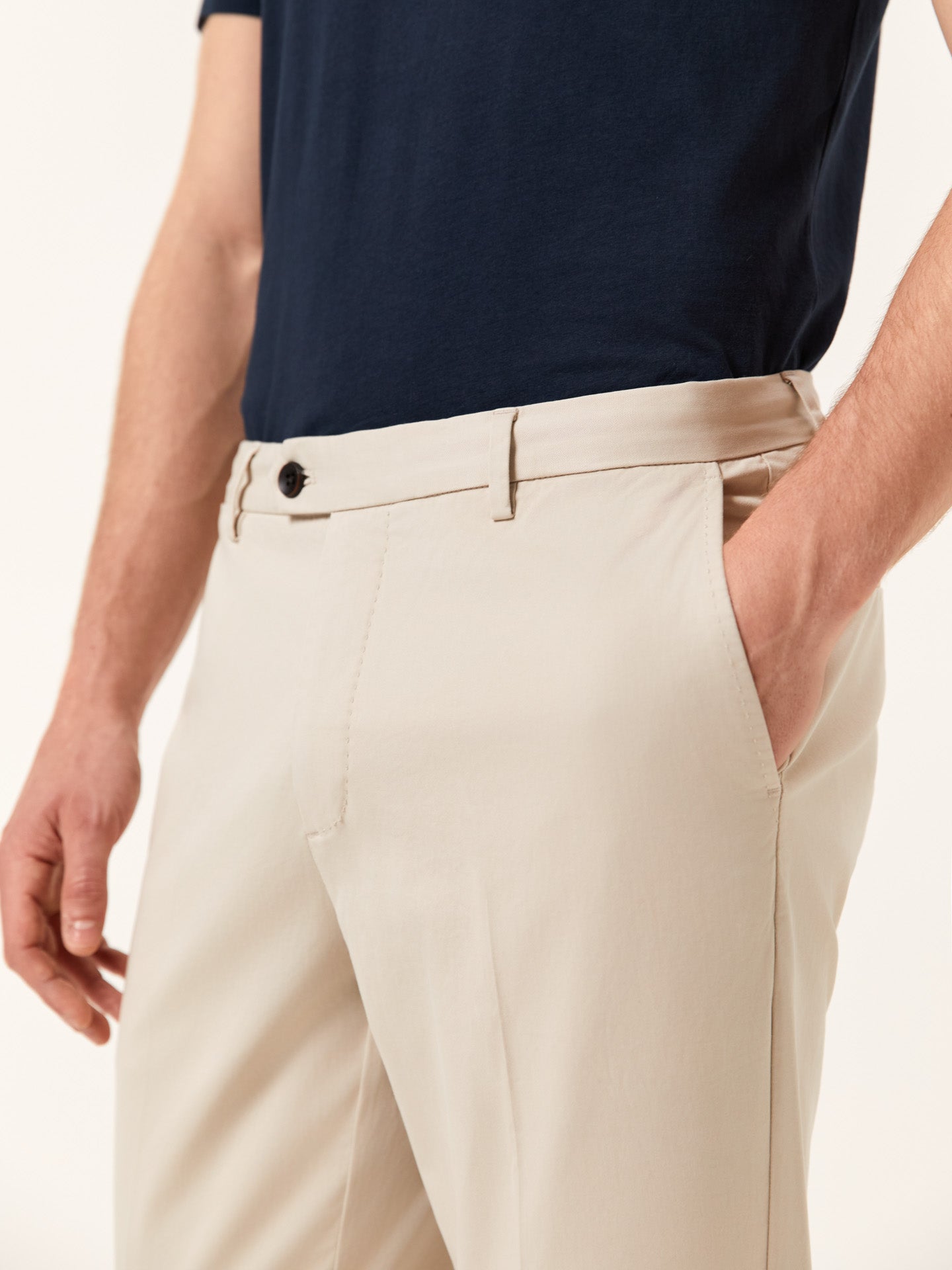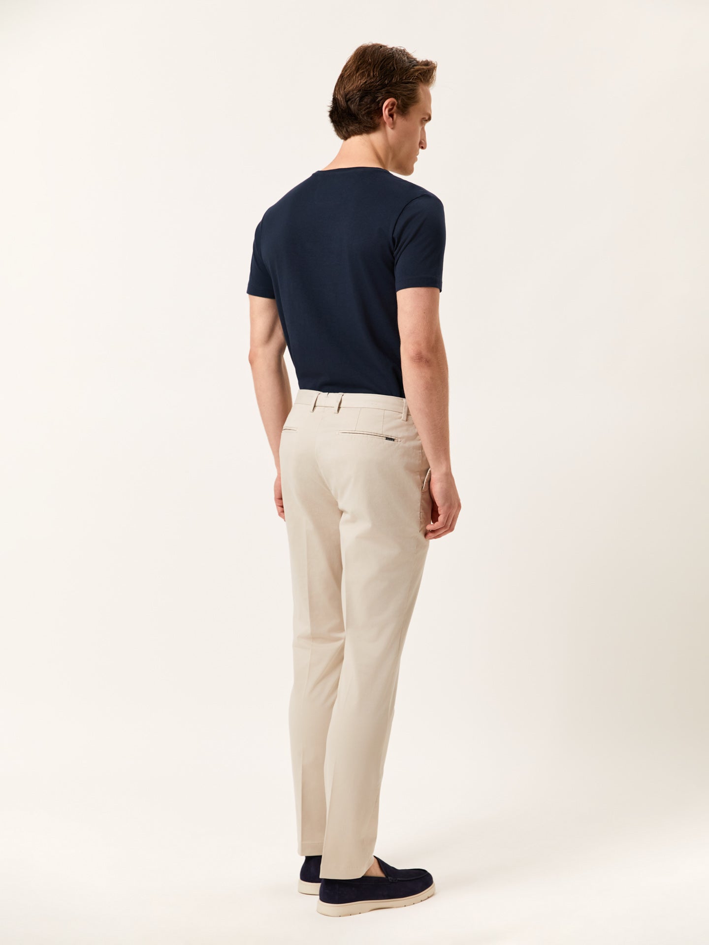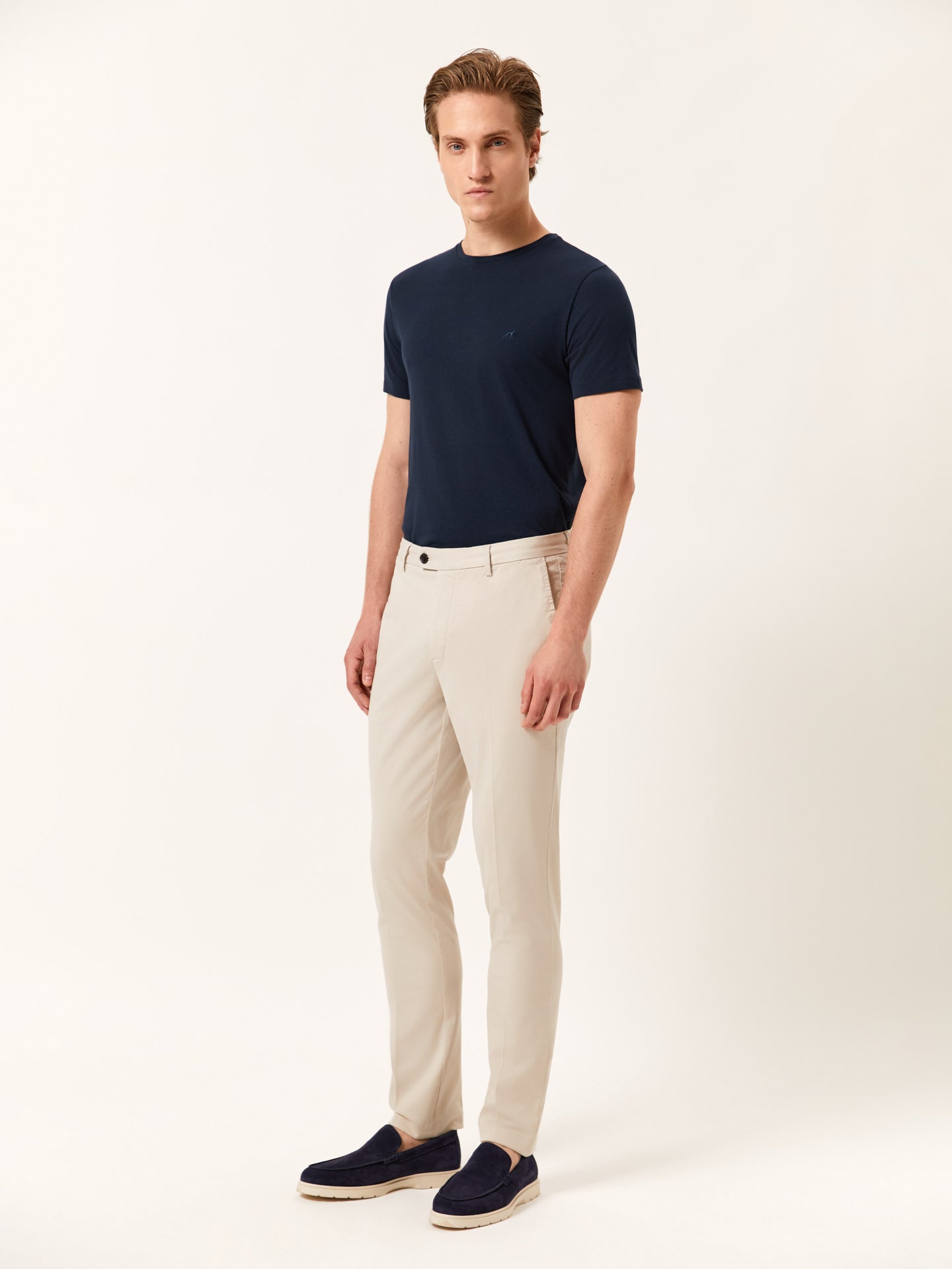 A refined piece that offers lasting elegance and easy versatility. Made from a blend of cotton and elastane, these trousers provide lightness, stretch, and all-day comfort. Designed in a slim fit, they feature a zip fly with branded button fastening, belt loops, two front slash pockets, and two back pockets. A woven brand label details the back pocket. Finished with a regular single-stitch hem. Ideal for the office or any occasion where looking sharp matters. Once you try them on, you won’t want to wear anything else.